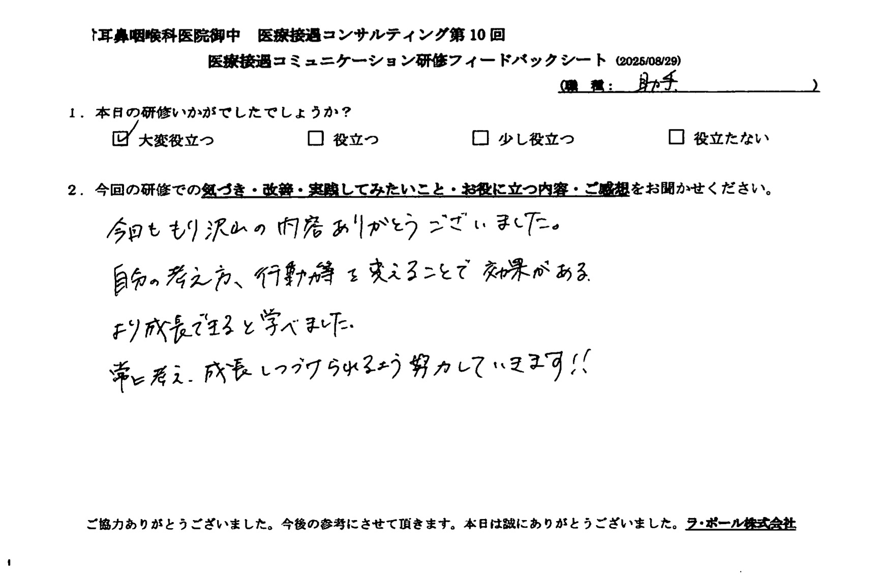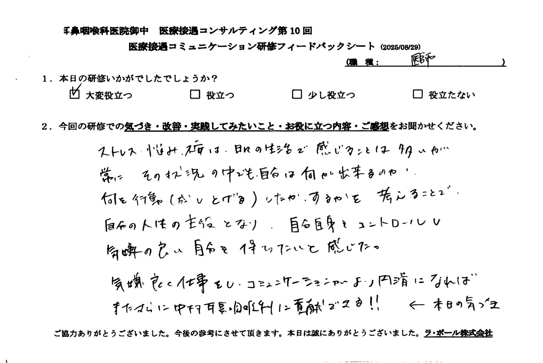 機嫌よく仕事をし、コミュニケーションがより円滑になればまたさらに○○耳鼻咽喉科に貢献できる‼ 本日の気づき。
