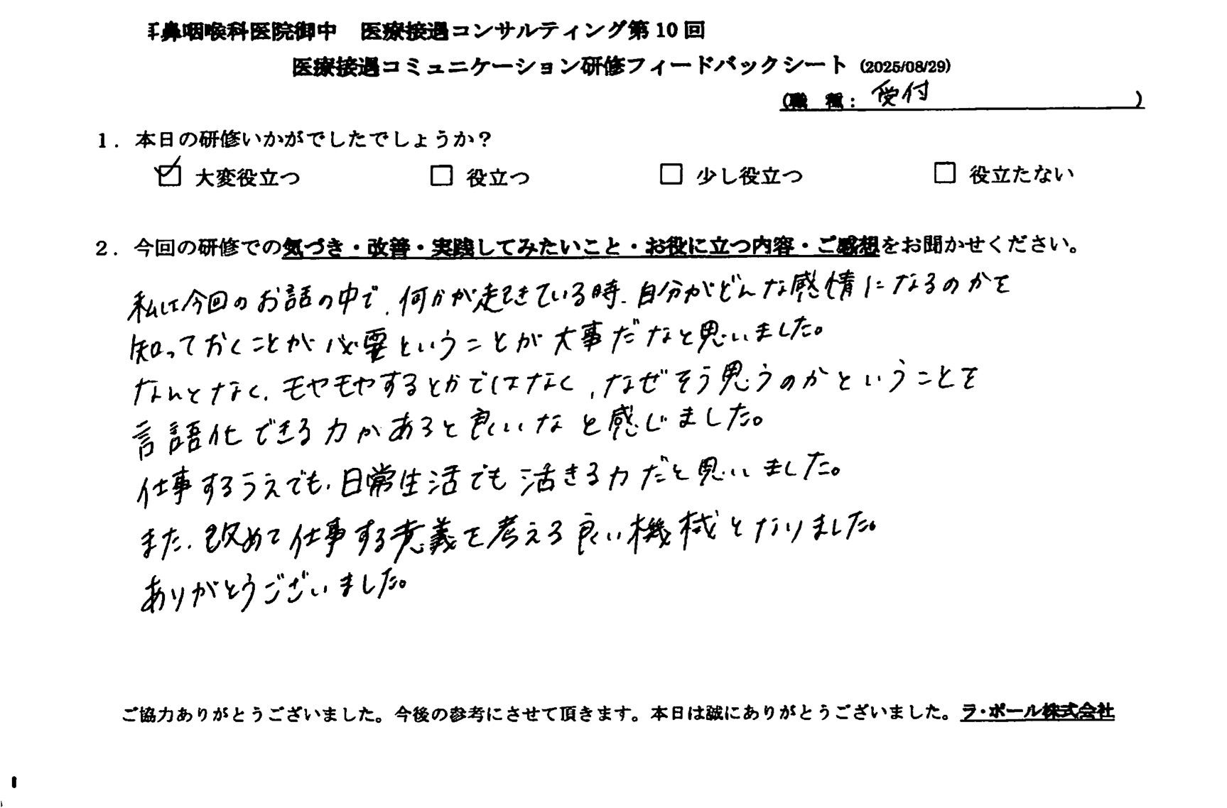 【受付】私は今回のお話の中で、何かが起きてる時、自分がどんな感情になるのかを知っておくことが必要ということが大事だなと思いました。