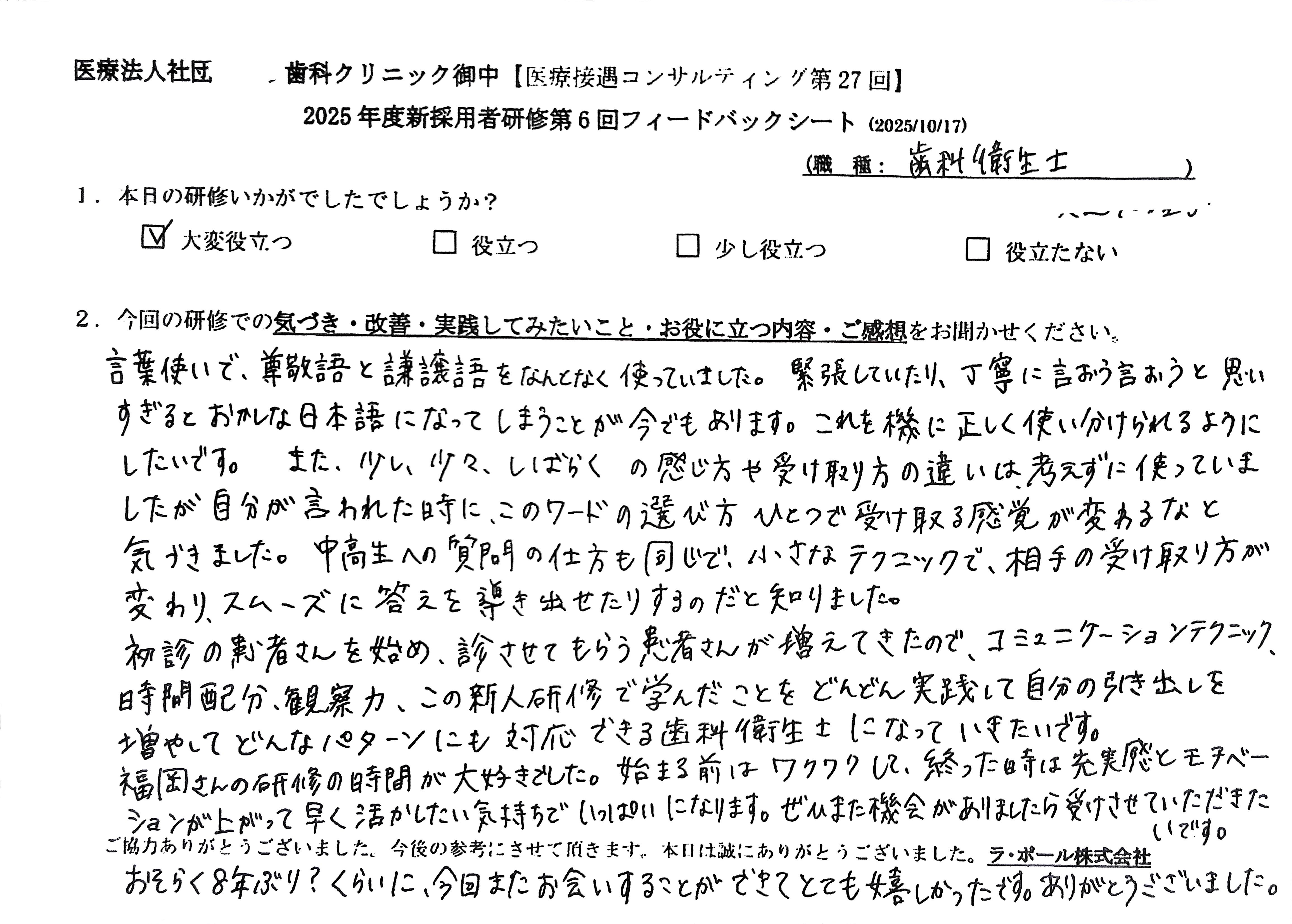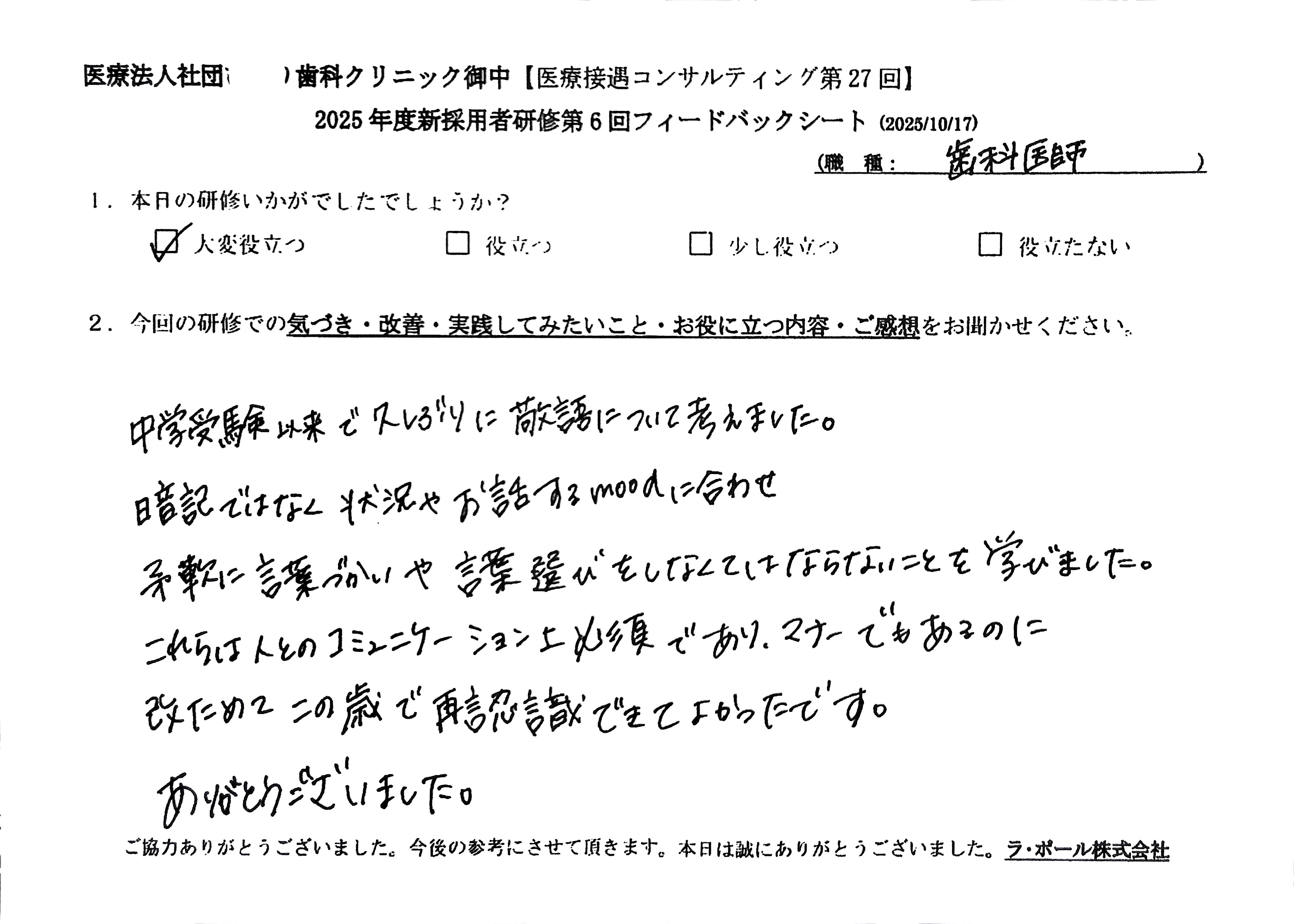 【歯科助手】自分では適切な表現だと思って使っていた言葉遣いが微妙に違っていたことに気づけることができ、今後は教えてくださった表現を使ってより丁寧な対応を心がけていきたいです。