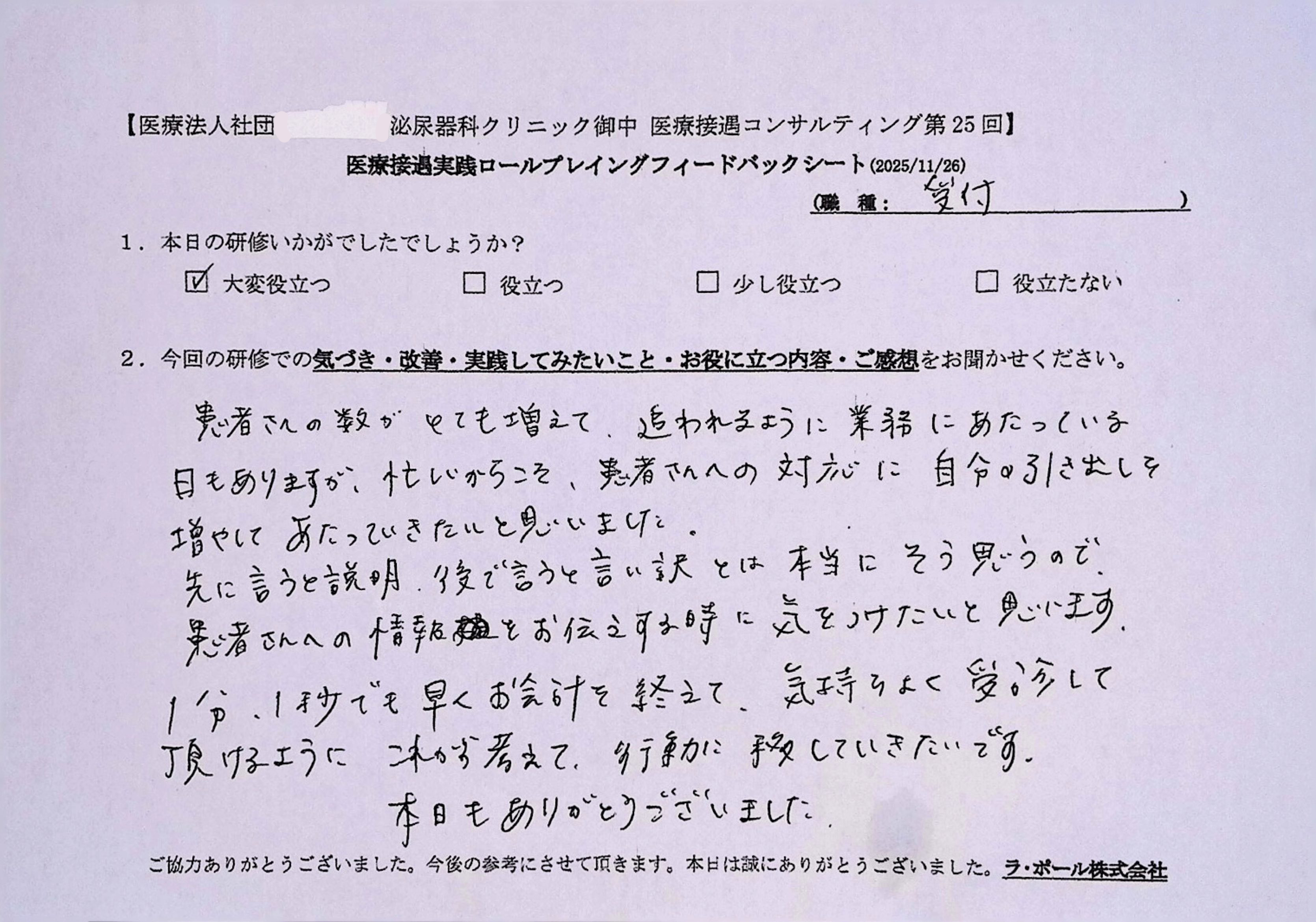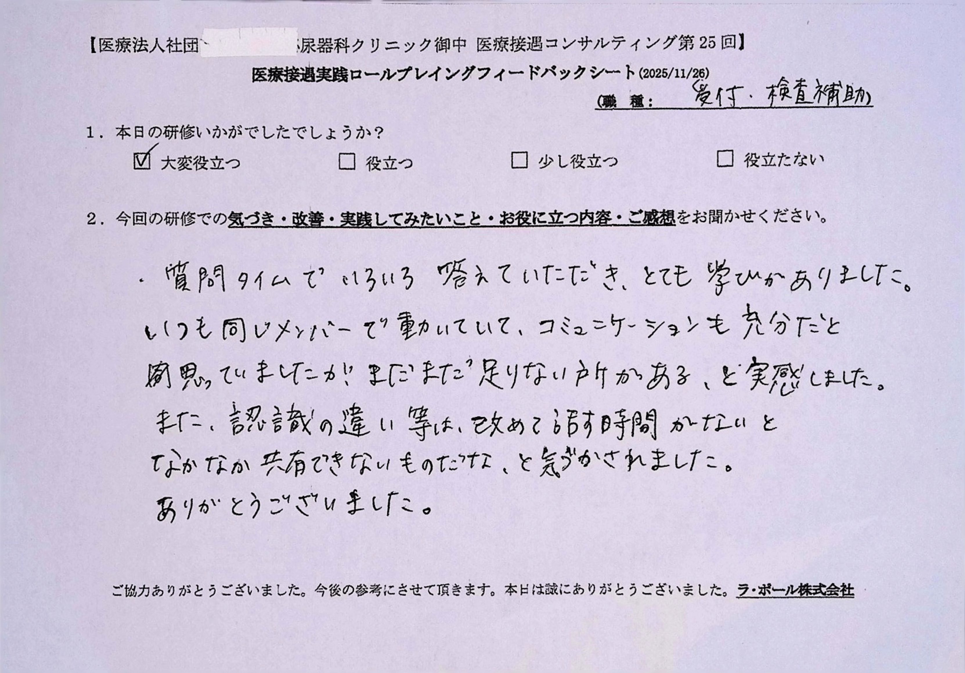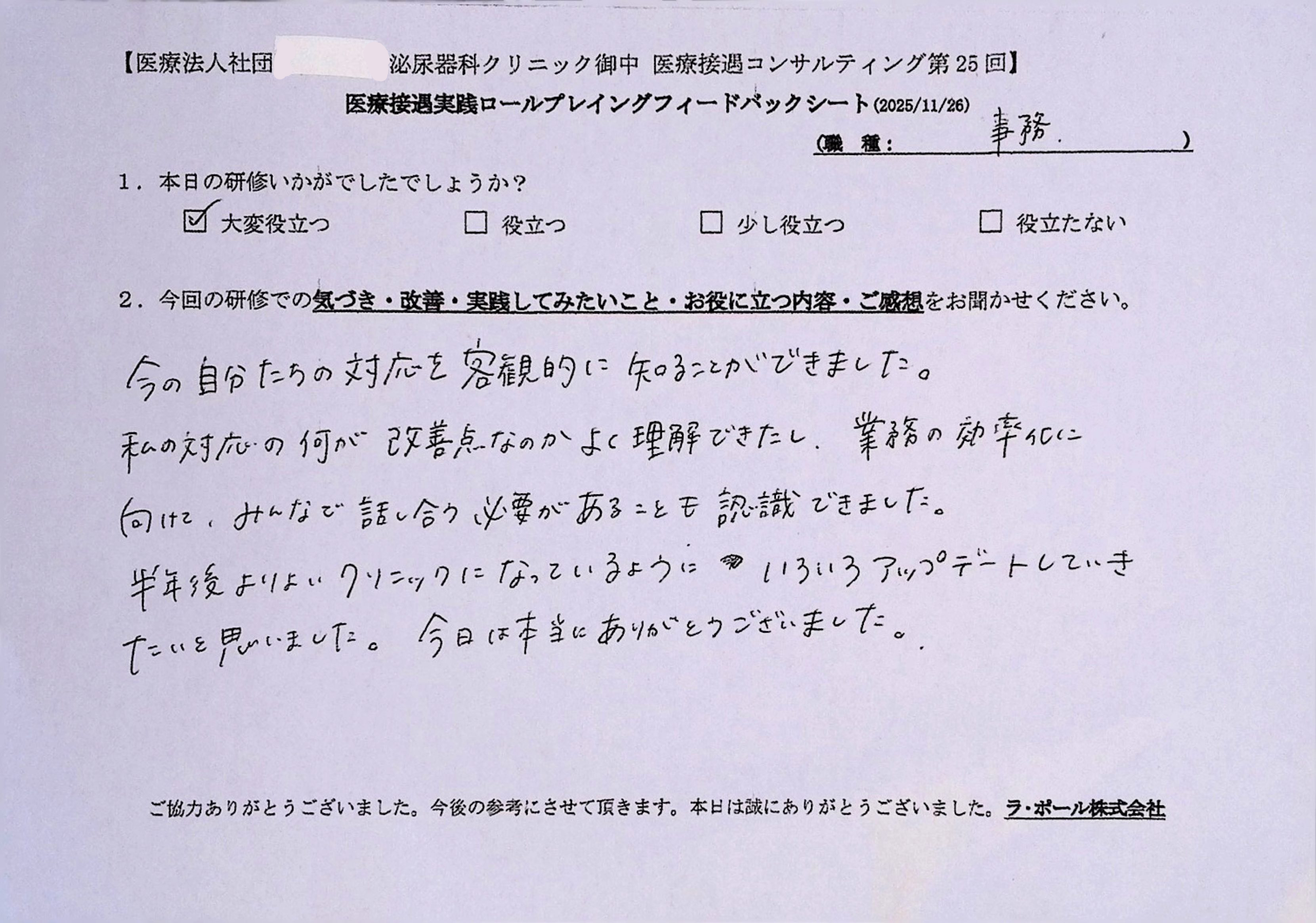 【事務】今の自分たちの対応を客観的に知ることができました。私の対応の何が改善点なのか、よく理解できたし、業務の効率化に向けてみんなで話し合う必要があることも認識できました。半年後より良いクリニックになっているように、いろいろアップデートしていきたいと思いました。今日は本当にありがとうございました。