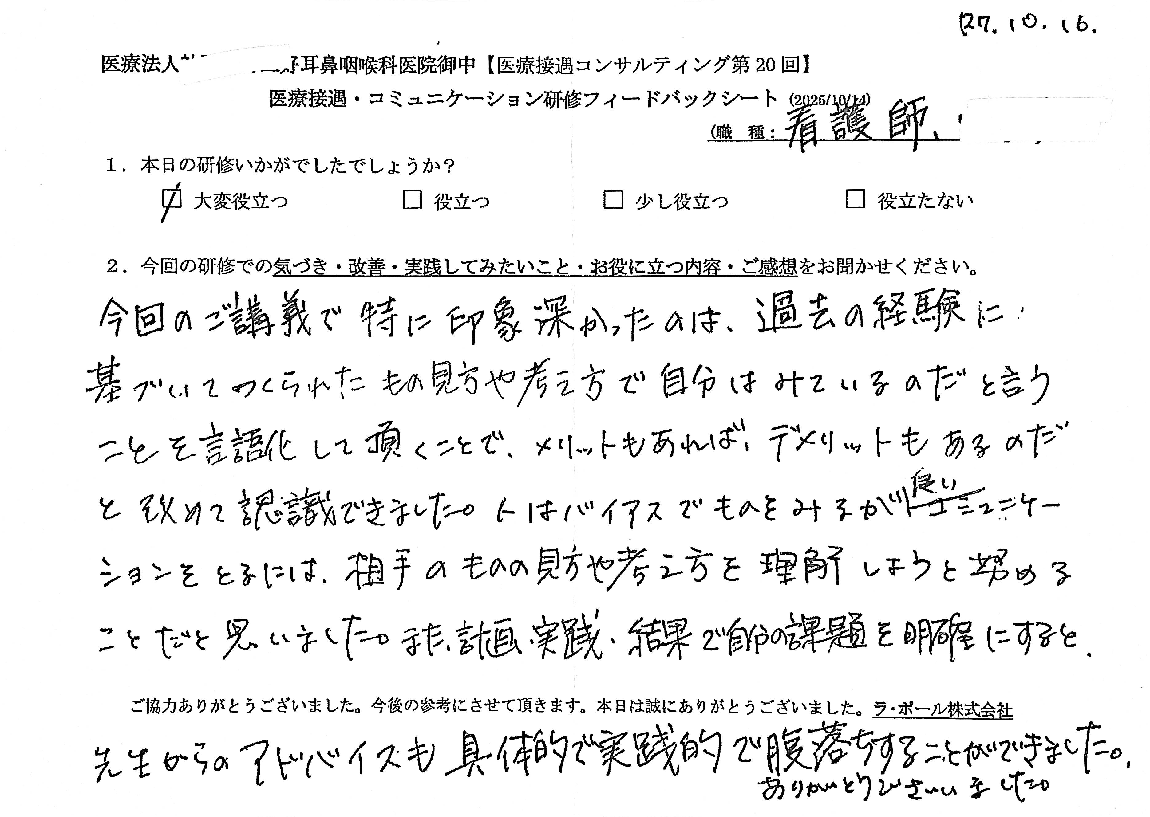 【事務】今回の研修では、特にパーソナルゾーンを意識して対応しようと思いました。