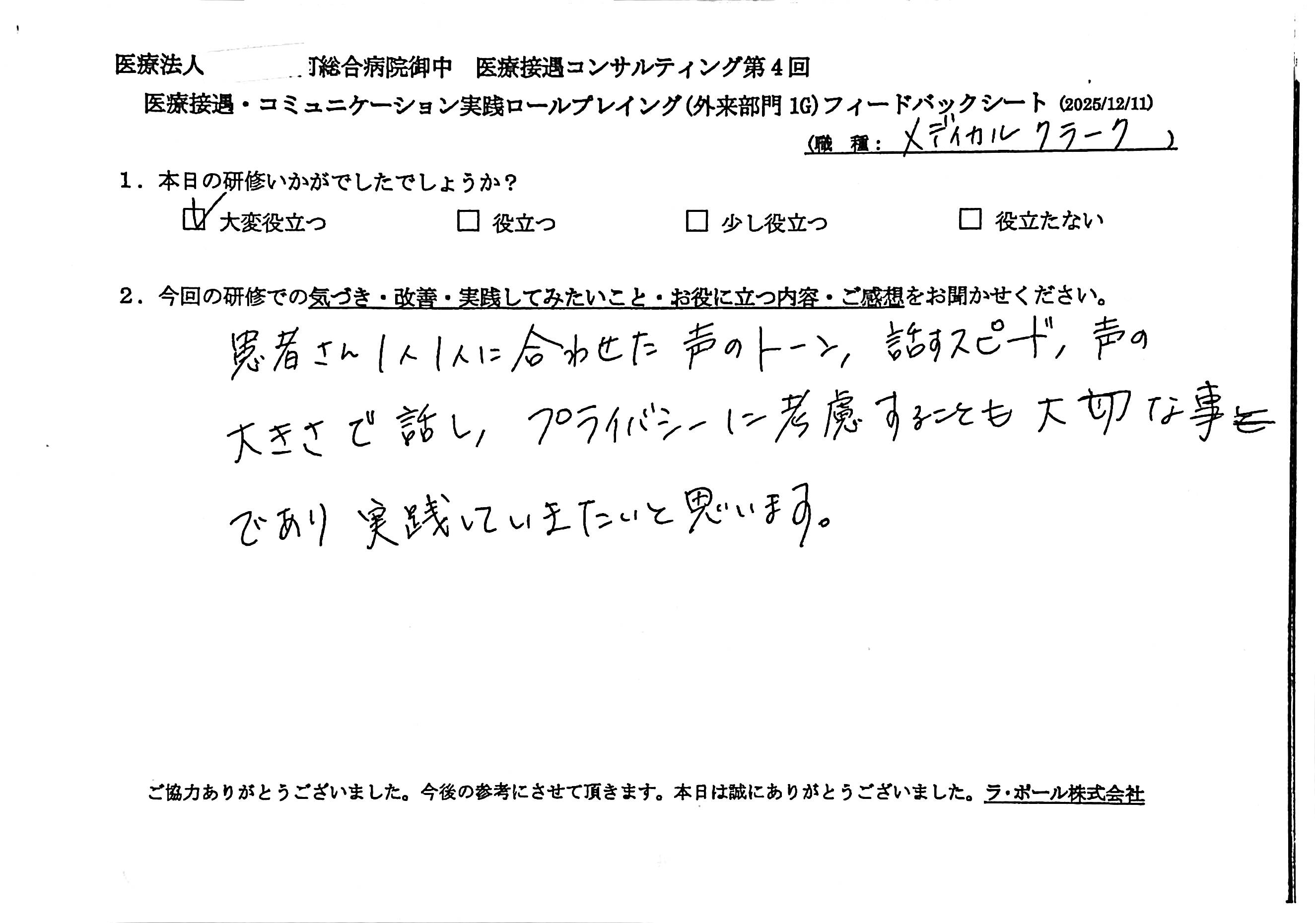 【メディカルクラーク】患者さん一人一人に合わせた声のトーン、話すスピード、声の大きさで話し、プライバシーに考慮することも大切なことであり実践していきたいと思います。