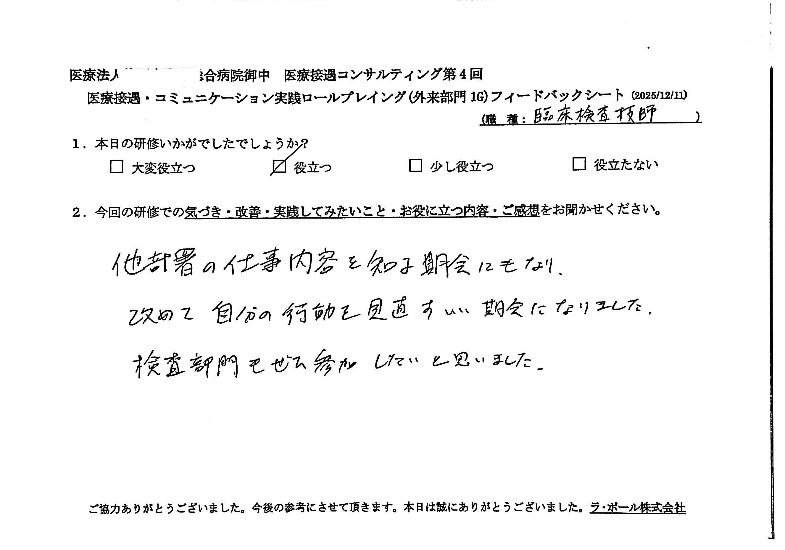 【臨床検査技師】他部署の仕事内容を知る機会にもなり、改めて自分の行動を見直すいい機会になりました。