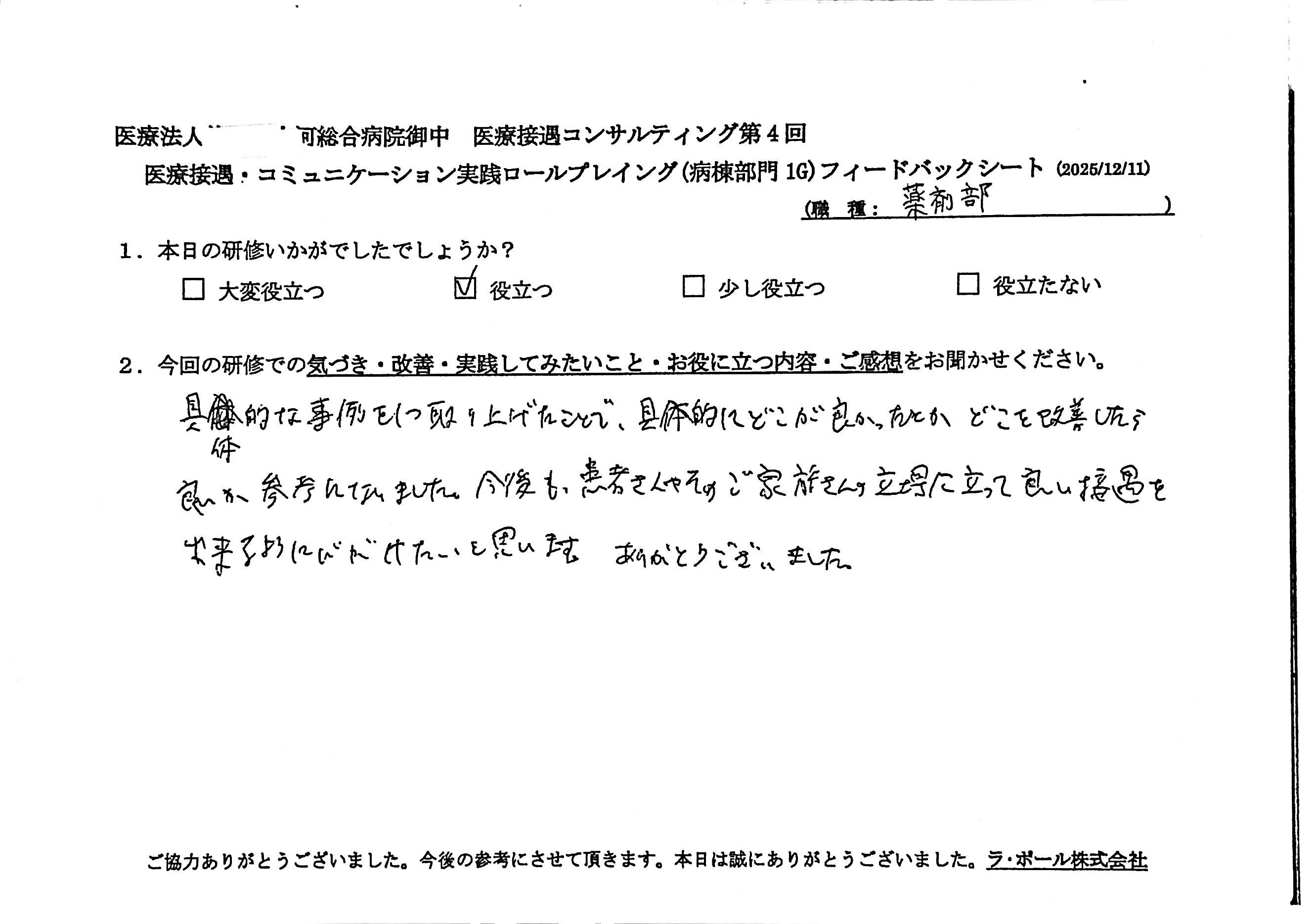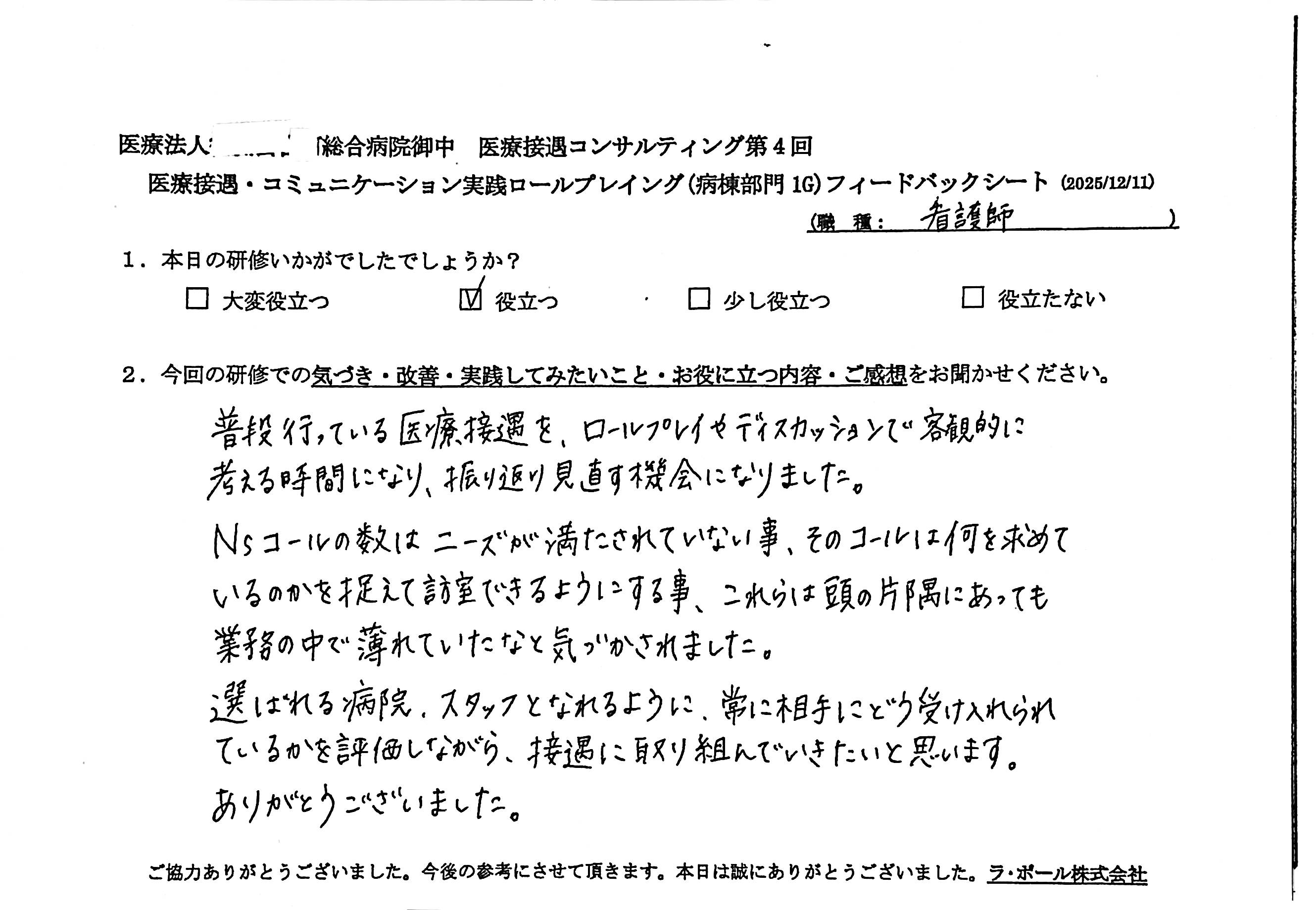 【看護師】普段行ってる医療接遇をロールプレイや ディスカッションで客観的に考える時間になり、振り返り見直す機会になりました。
