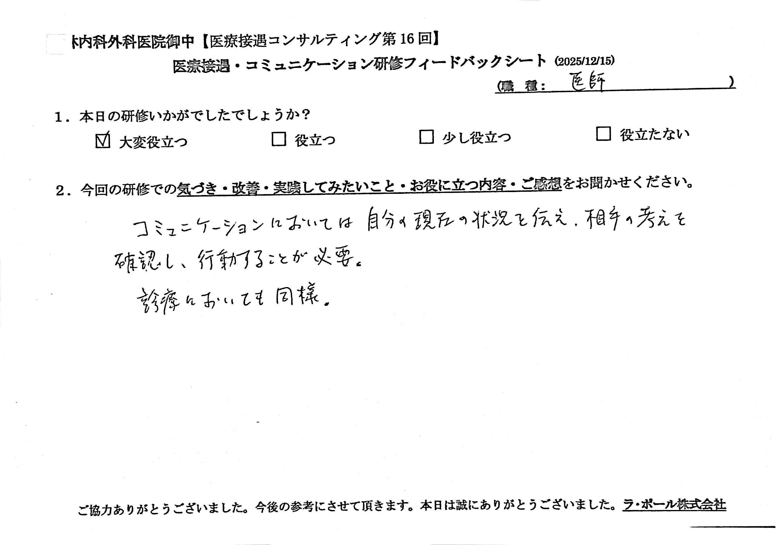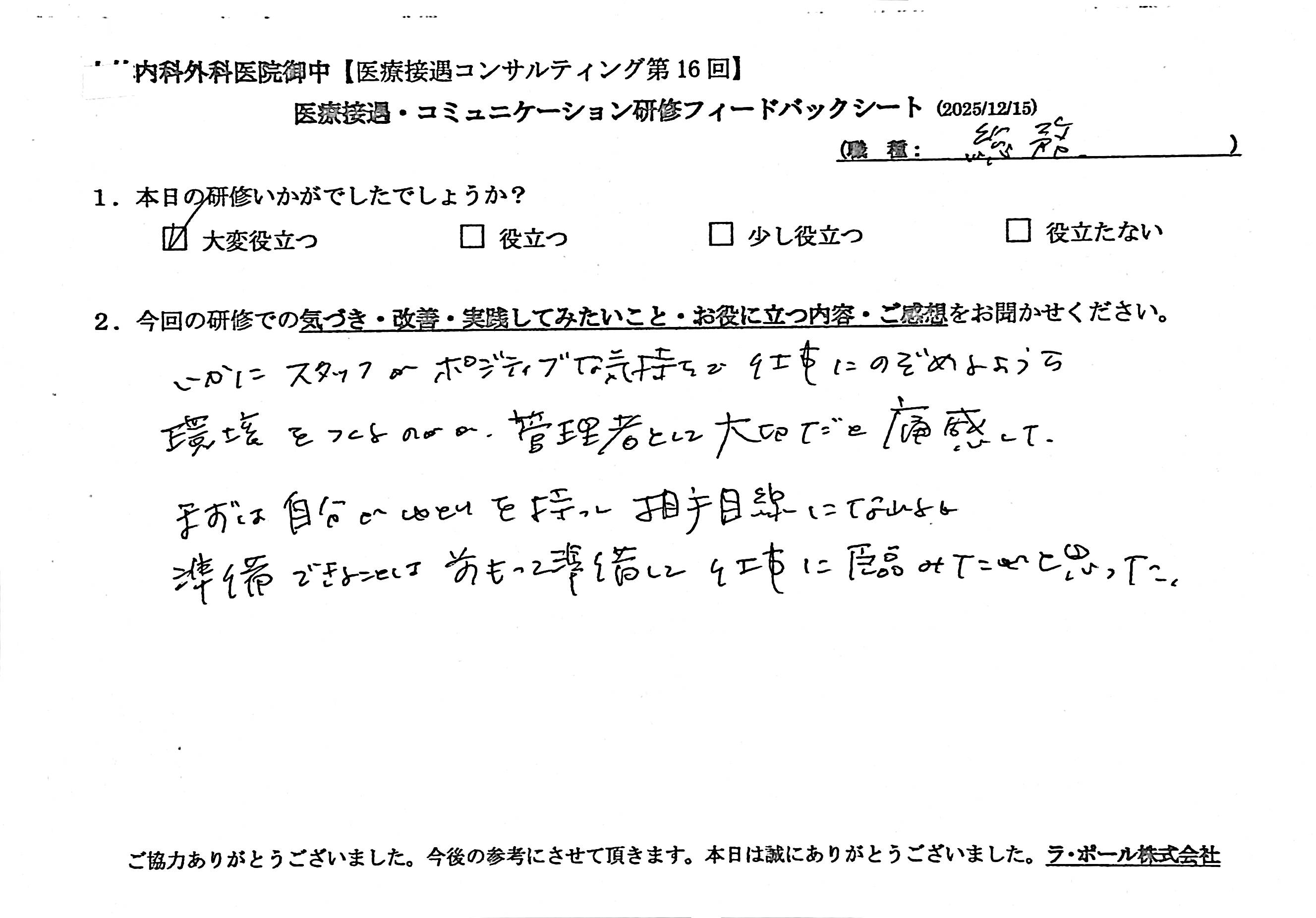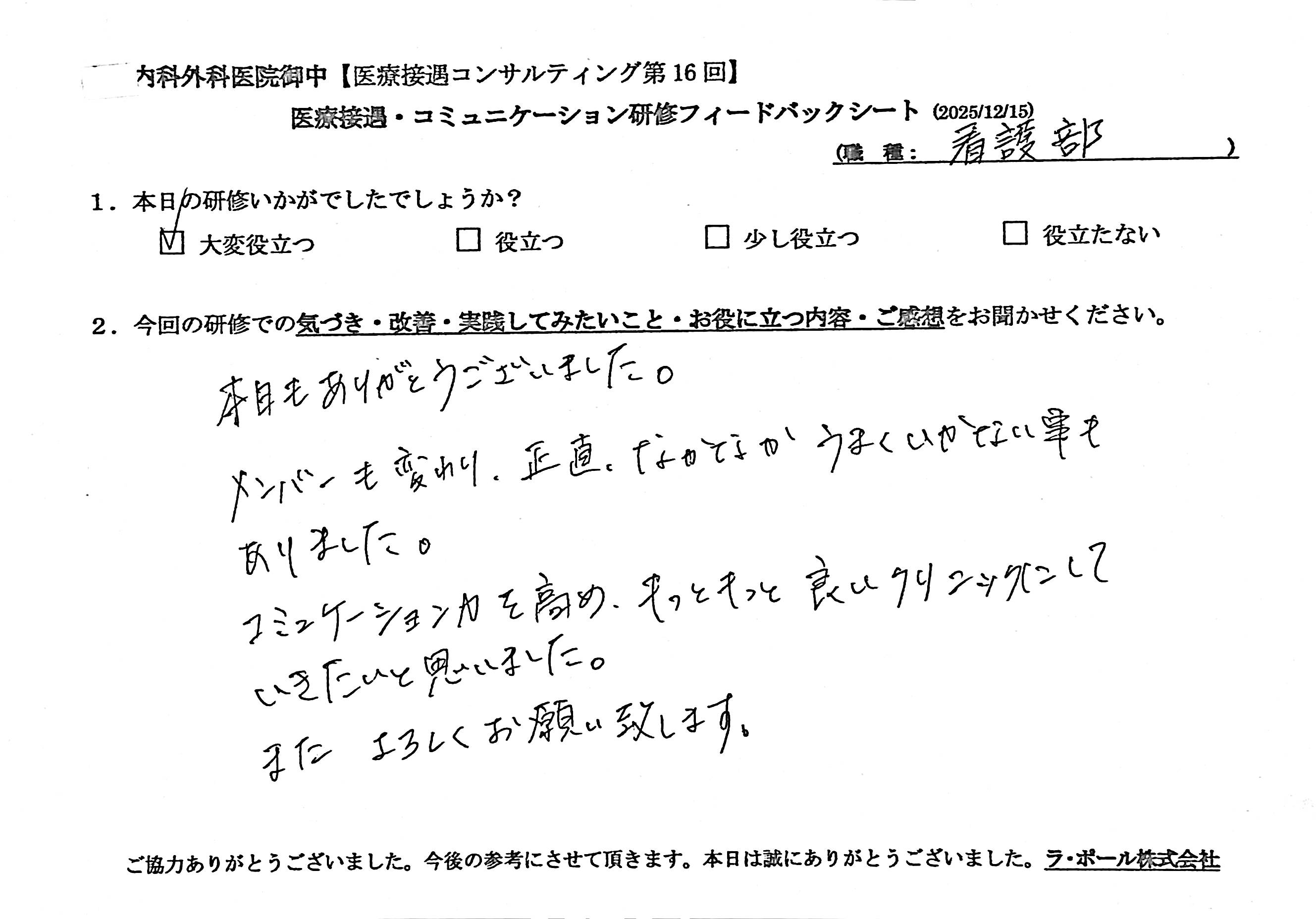 コミュニケーション力を高め、もっともっと良いクリニックにしていきたいと思いました。 またよろしくお願いいたします。