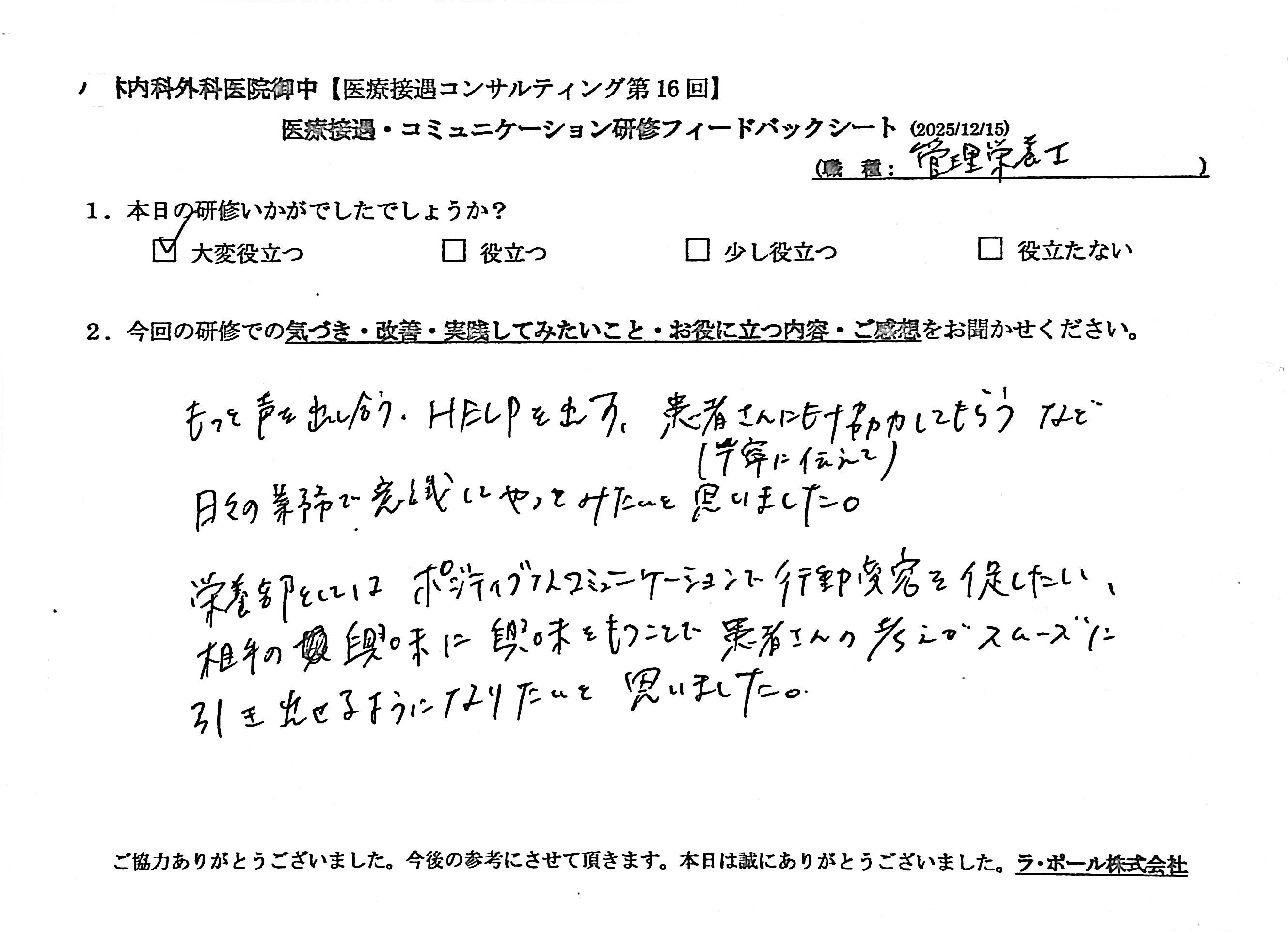 【管理栄養士】もっと声を出し合う、へルプを出す、患者さんにも協力してもらう など、日々の業務で意識してやってみたいと思いました。