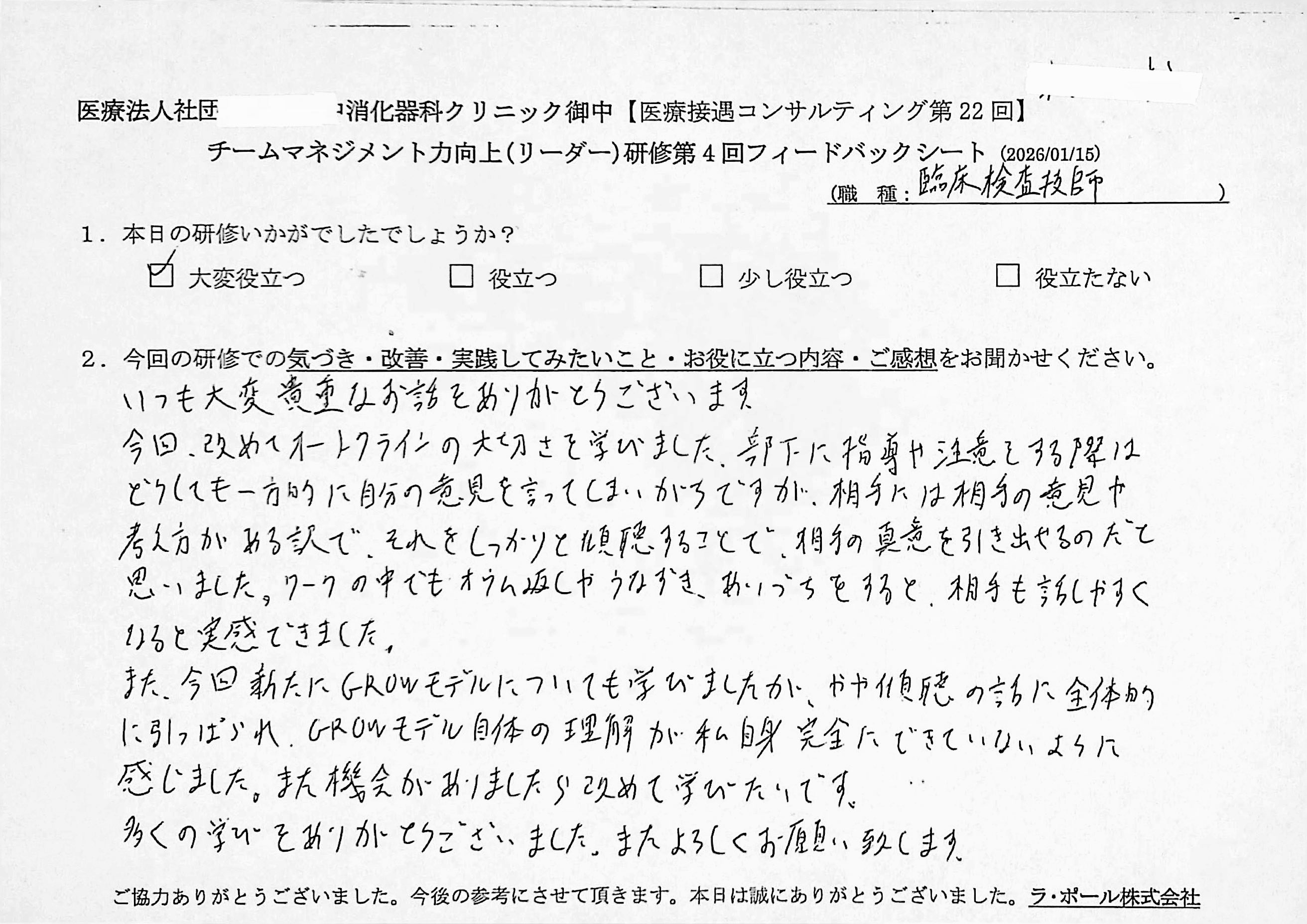 【臨床検査技師】今回の研修もとても学びの多い内容でした。ありがとうございました。 オートクラインの考え方をはじめ、スタッフそれぞれのコミュニケーション特性や傾向を理解することの重要性について学ぶことができました。 また自分自身の特性を見つめ直す良い機会にもなりました。 ヒアリングのトレーニングでは、自分でをうまく言葉にできない部分を要約してもらったことで、頭の中が整理されました。 聞く側になった時はどうやって質問すれば良いかや、傾聴や確認を意識して取り入れる意味がよく分かりました。 また、自分自身が上司は先輩からご指導いただいた時や面談の時に、先生のお話の中で出てきた訊き方や話し方のテクニックを使われていたのを思い出し、自分もその上司や先輩のように実践してる行けるようになりたいと思いました。 今回の内容も日々の業務や自分の生活の中でも取り入れさせていただきたいと思います。 本当にありがとうございました。