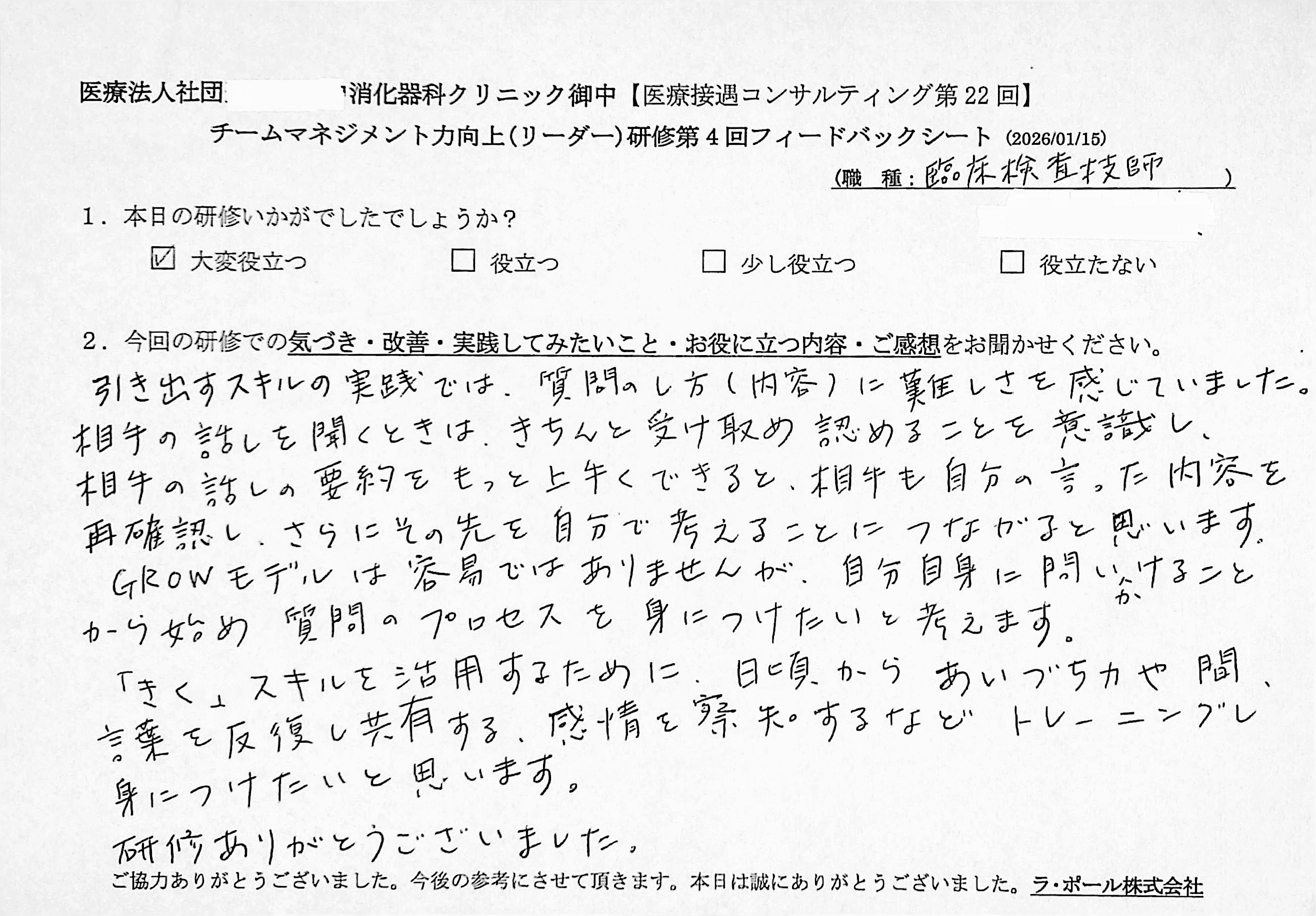 【臨床検査技師】いつも大変貴重なお話をありがとうございます。 今回改めてオートクラインの大切さを学びました。部下に指導や注意をする際はどうしても一方的に自分の意見を言ってしまいがちですが、相手には相手の意見や考え方があるわけで それをしっかりと傾聴することで相手の真意を引き出せるのだと思いました。 ワークの中でもオウム返しやうなずき、あいづちをすると相手も話しやすくなると実感できました。 また、今回新たにGROWモデルについても学びましたが、やや傾聴の話に全体的に引っ張られGROWモデル自体の理解が私自身完全にできていないように感じました。 また機会がありましたら改めて学びたいです。 多くの学びをありがとうございました。またよろしくお願いいたします。