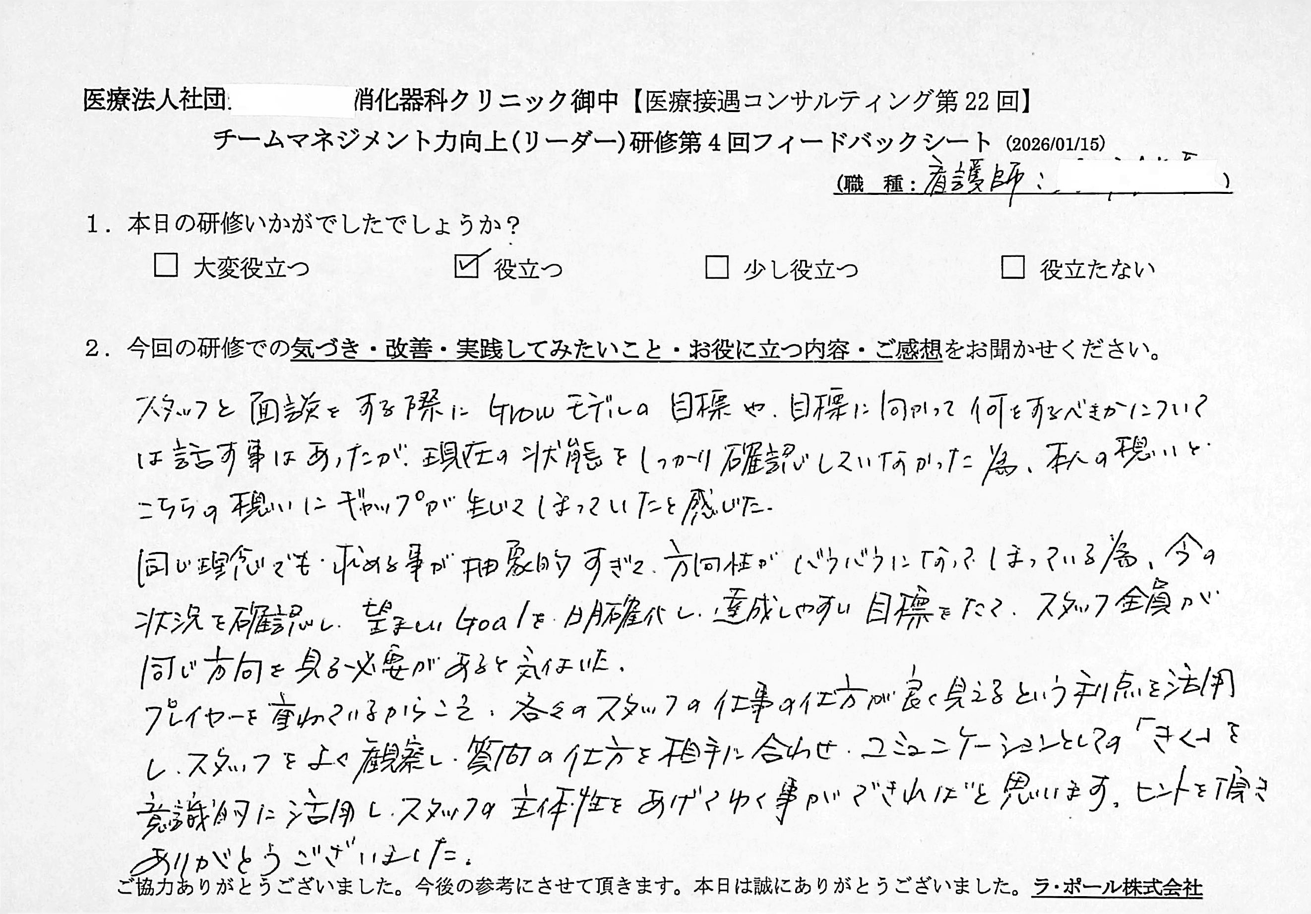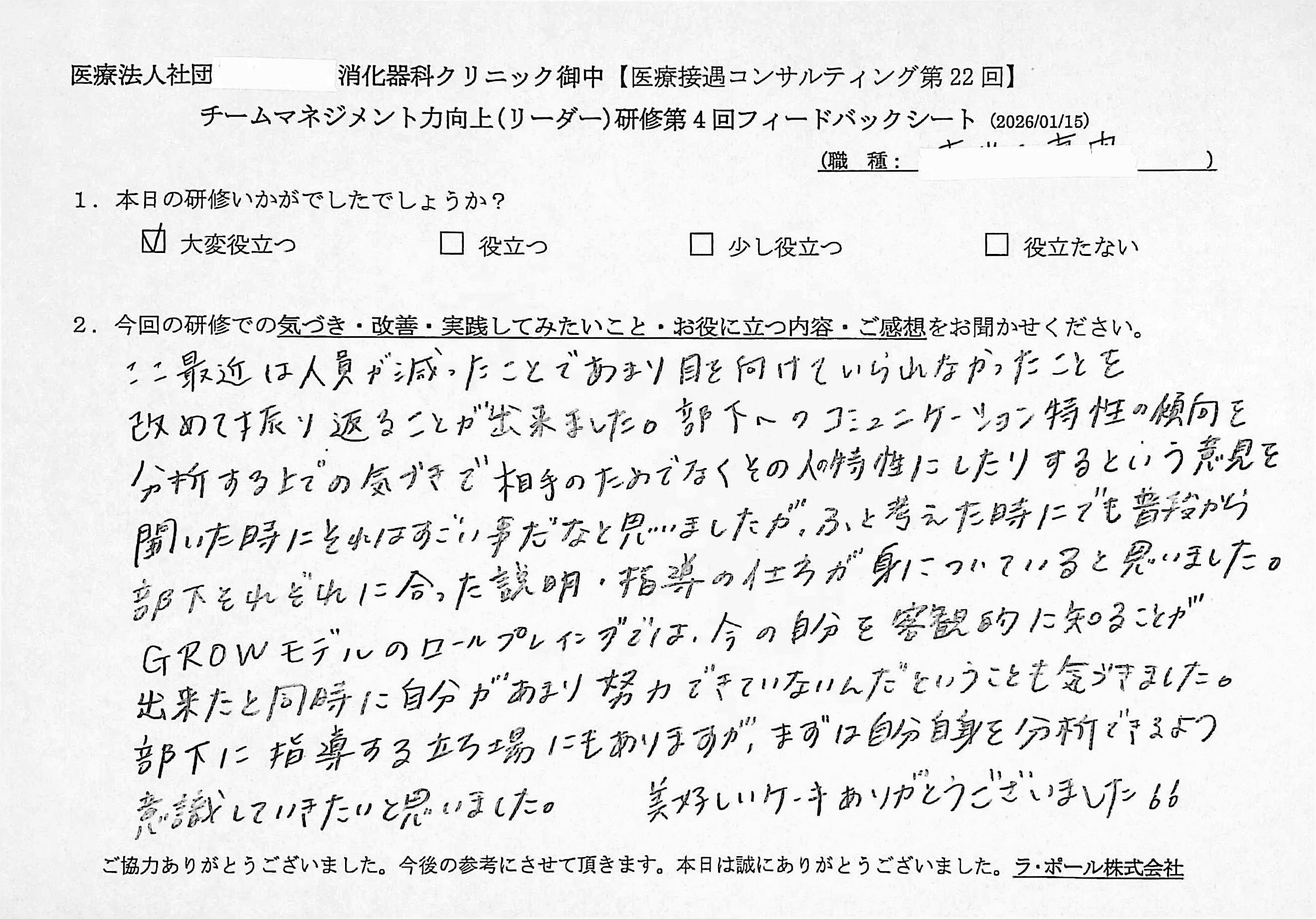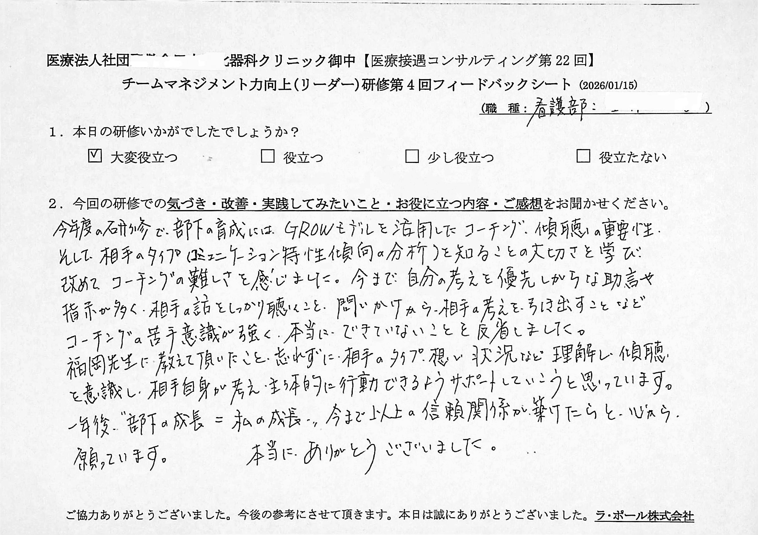 【看護師】今年度の研修で部下の育成にはGROWモデルを活用したコーチング、傾聴の重要性そして相手のタイプ(コミュニケーション特性傾向の分析)を知ることの大切さを学び、改めてコーチングの難しさを感じました。 今まで自分の考えを優先しながら助言や指示が多く、相手の話をしっかり聴くこと、問いかけから相手の考えを引き出すことなどコーチングの苦手意識は強く、本当にできてないことを反省しました。 福岡先生に教えていただいたことを忘れずに、相手のタイプ、想い、状況など理解し、傾聴を意識し、相手自身が考え主体的に行動できるようサポートしていこうと思います。 1年後"部下の成長=私の成長"今まで以上の信頼関係が築けたらと心から願っています。本当にありがとうございました。