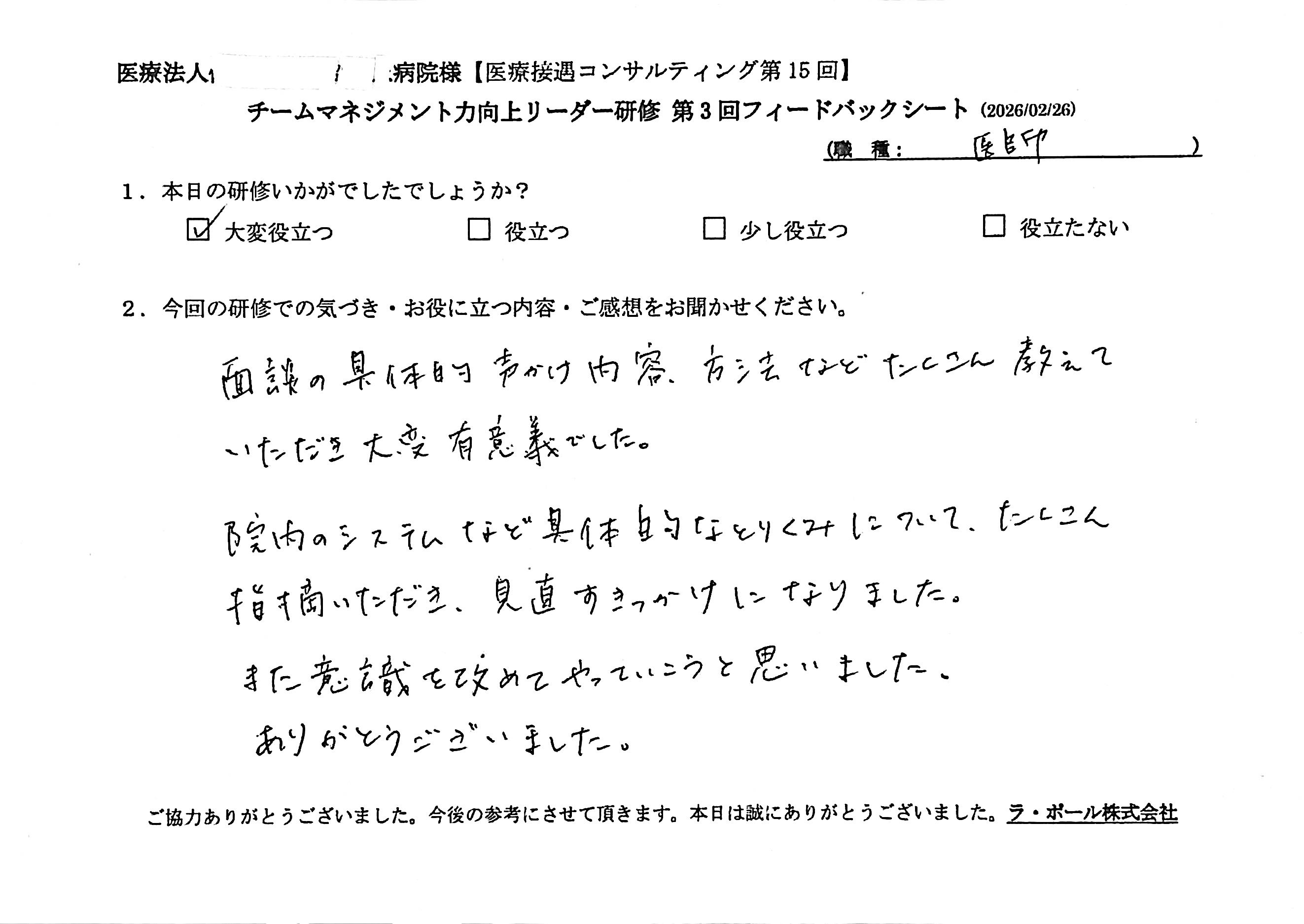 【医師】面談の具体的声掛け 内容、方法などたくさん教えていただき大変有意義でした。