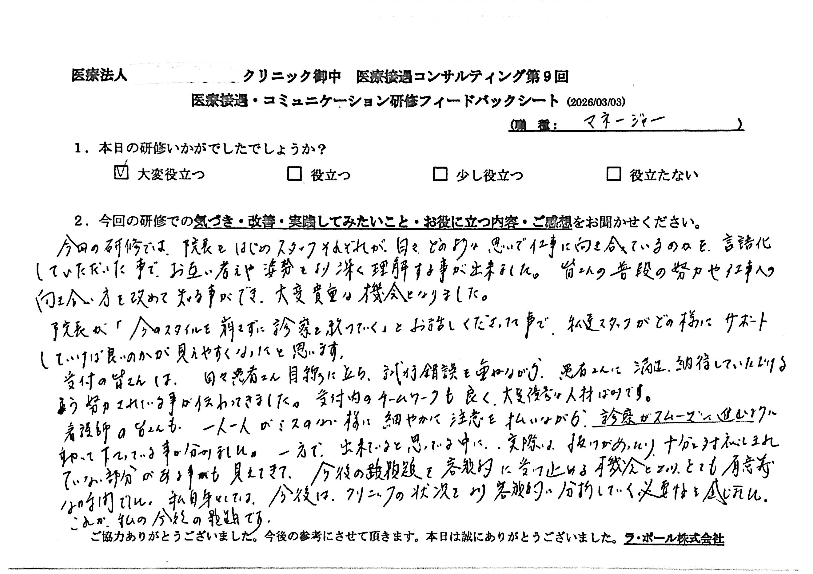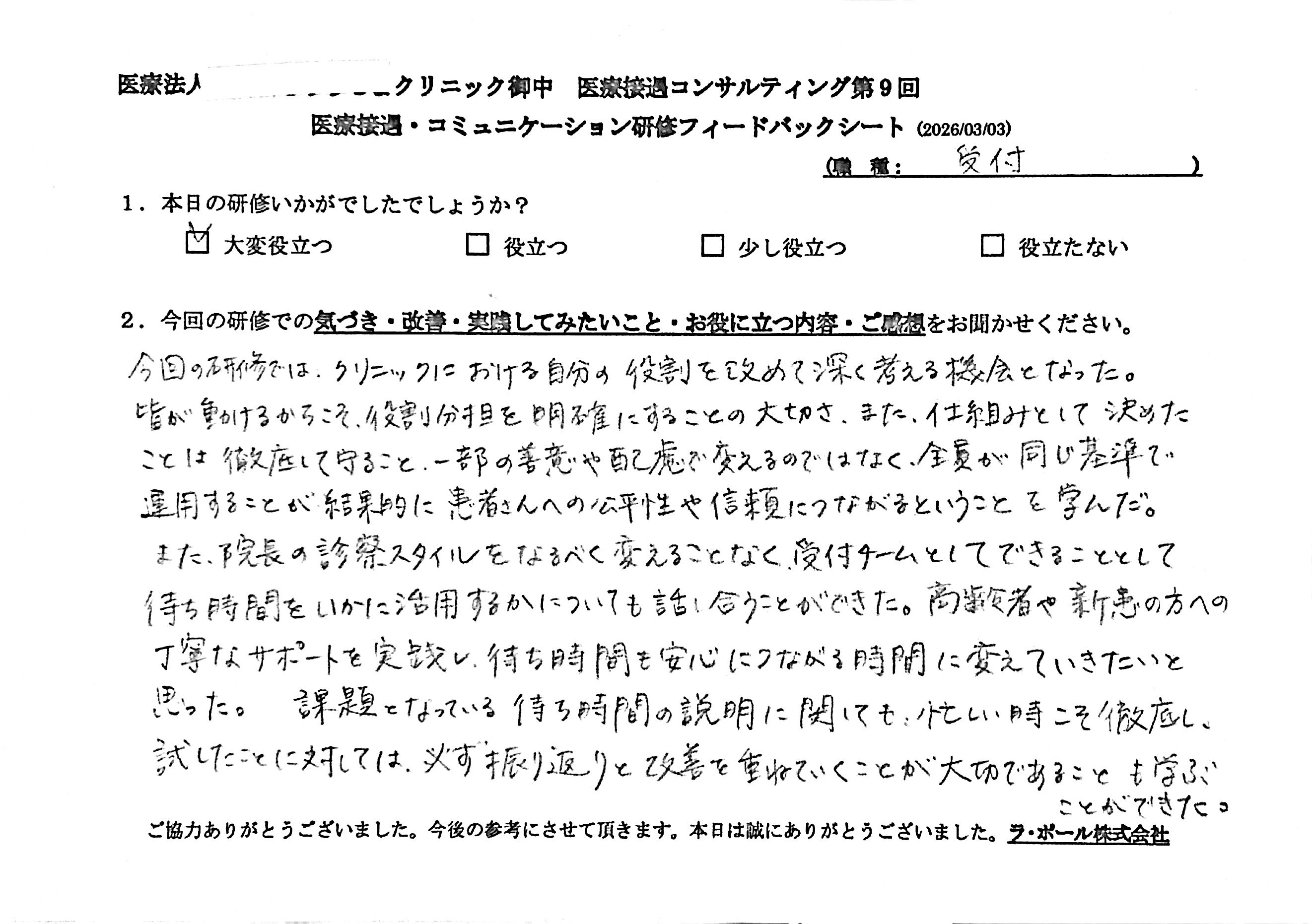 【受付】今回の研修では、クリニックにおける自分の役割を改めて深く考える機会となった/2026/3/3開催