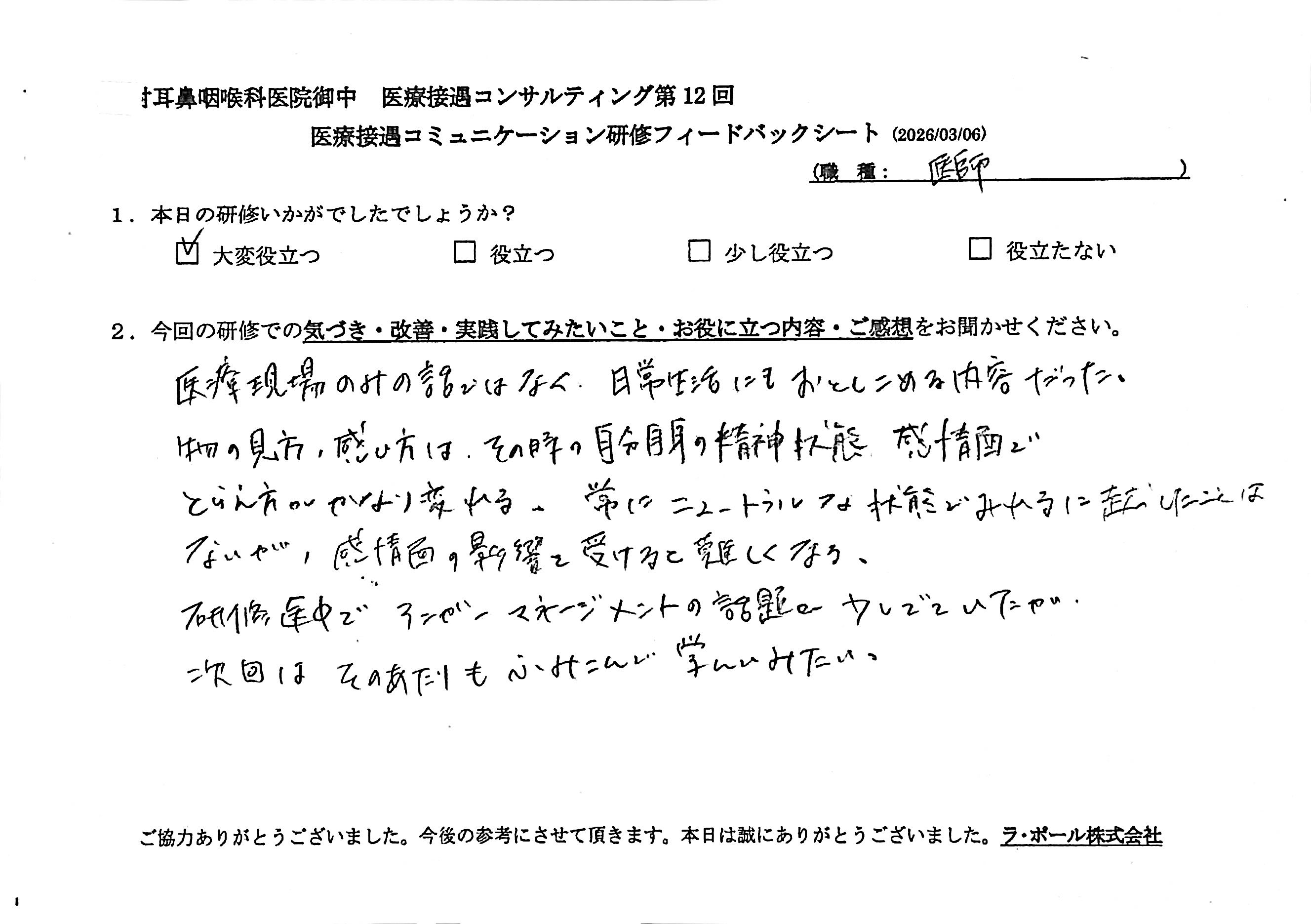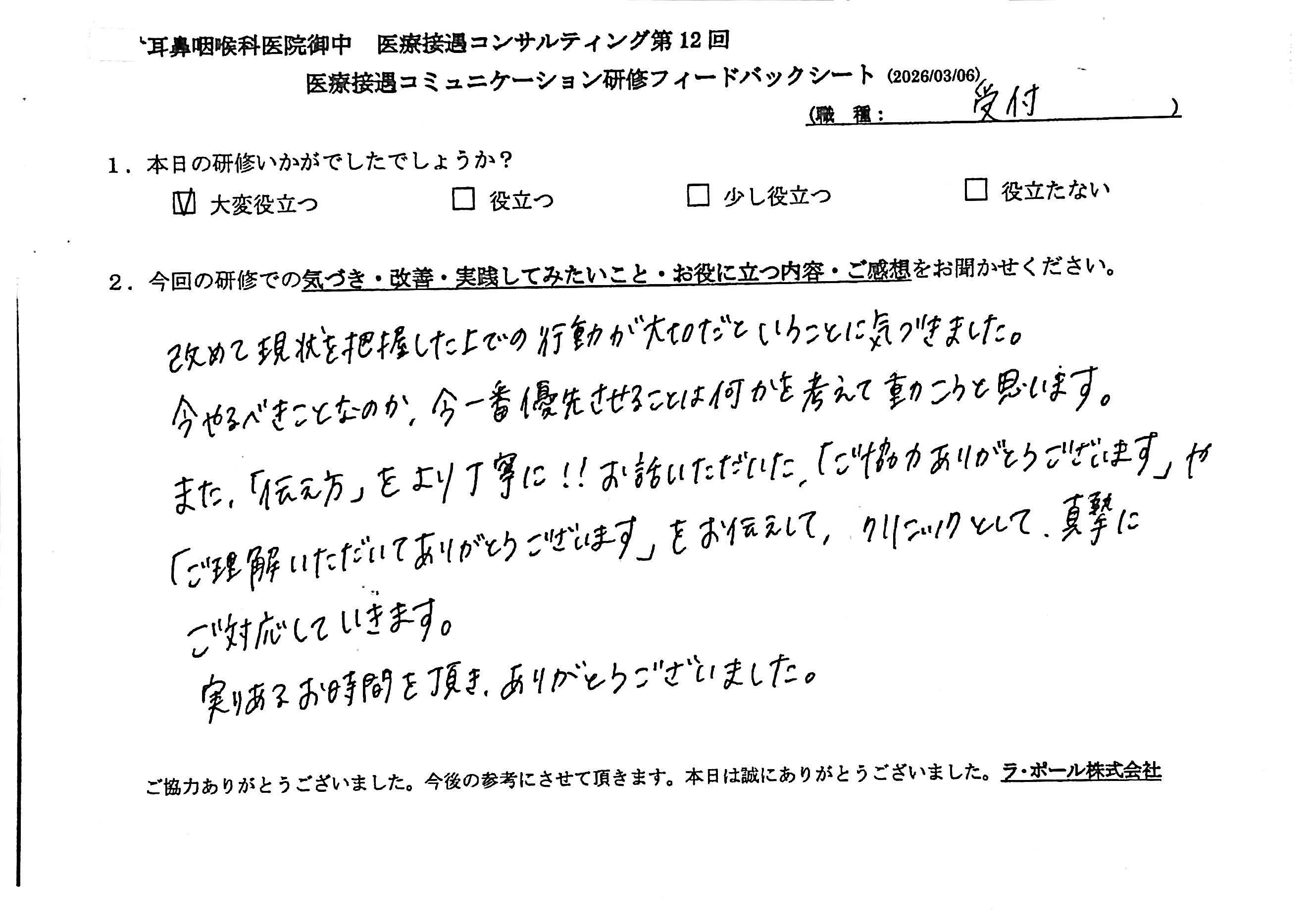 また、「伝え方」をより丁寧に!!お話しいただいた 「ご協力ありがとうございます」や「ご理解いただいてありがとうございます」をお伝えして、クリニックとして、真摯にご対応していきます。、実りある時間をいただきありがとうございました。