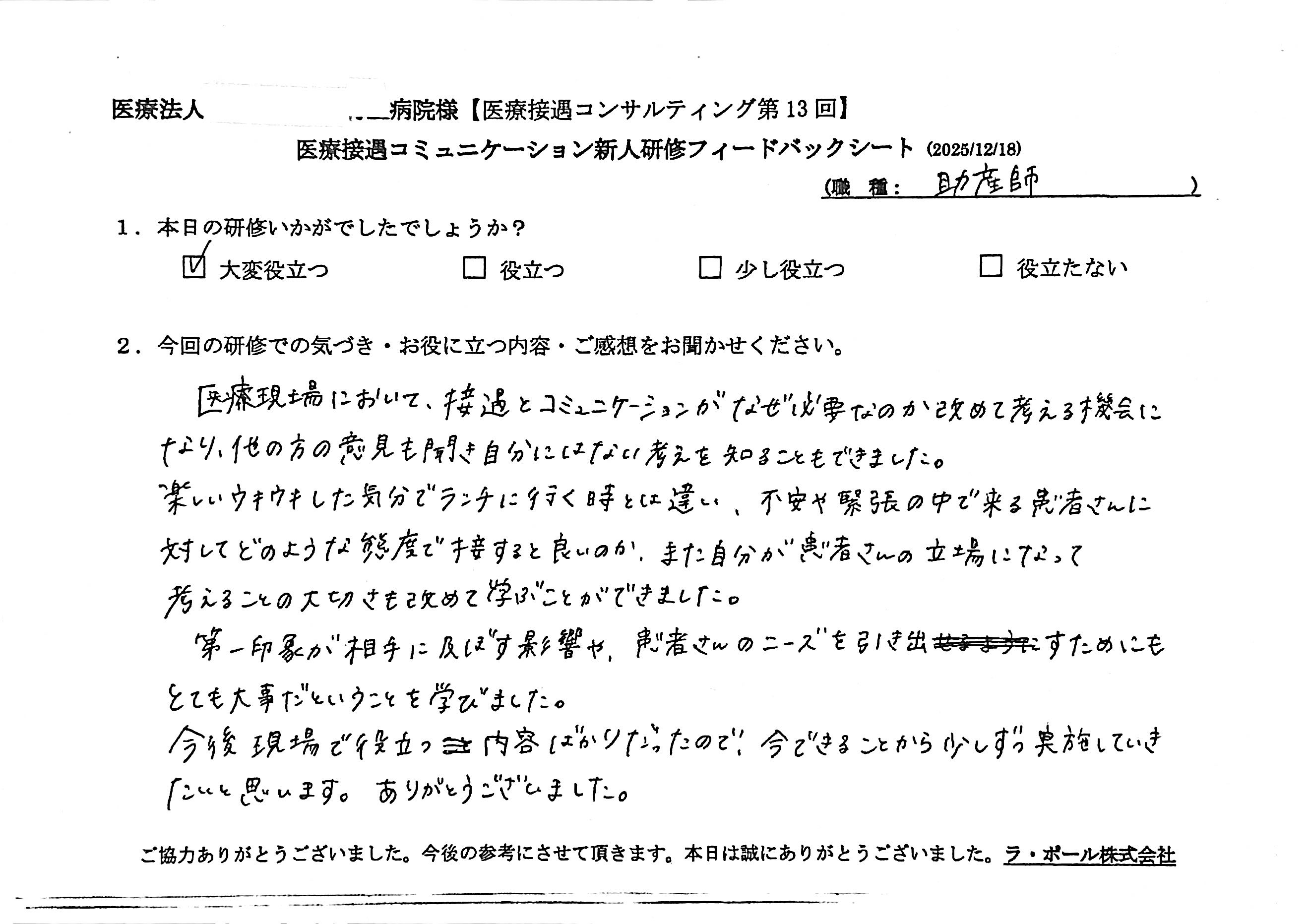 【助産師】楽しいウキウキした気分でランチに行く時とは違い、不安や緊張の中でくる患者さんに対してどのような態度で接すると良いのか、また自分が 患者さんの立場になって考えることの大切さを改めて学ぶことができました。