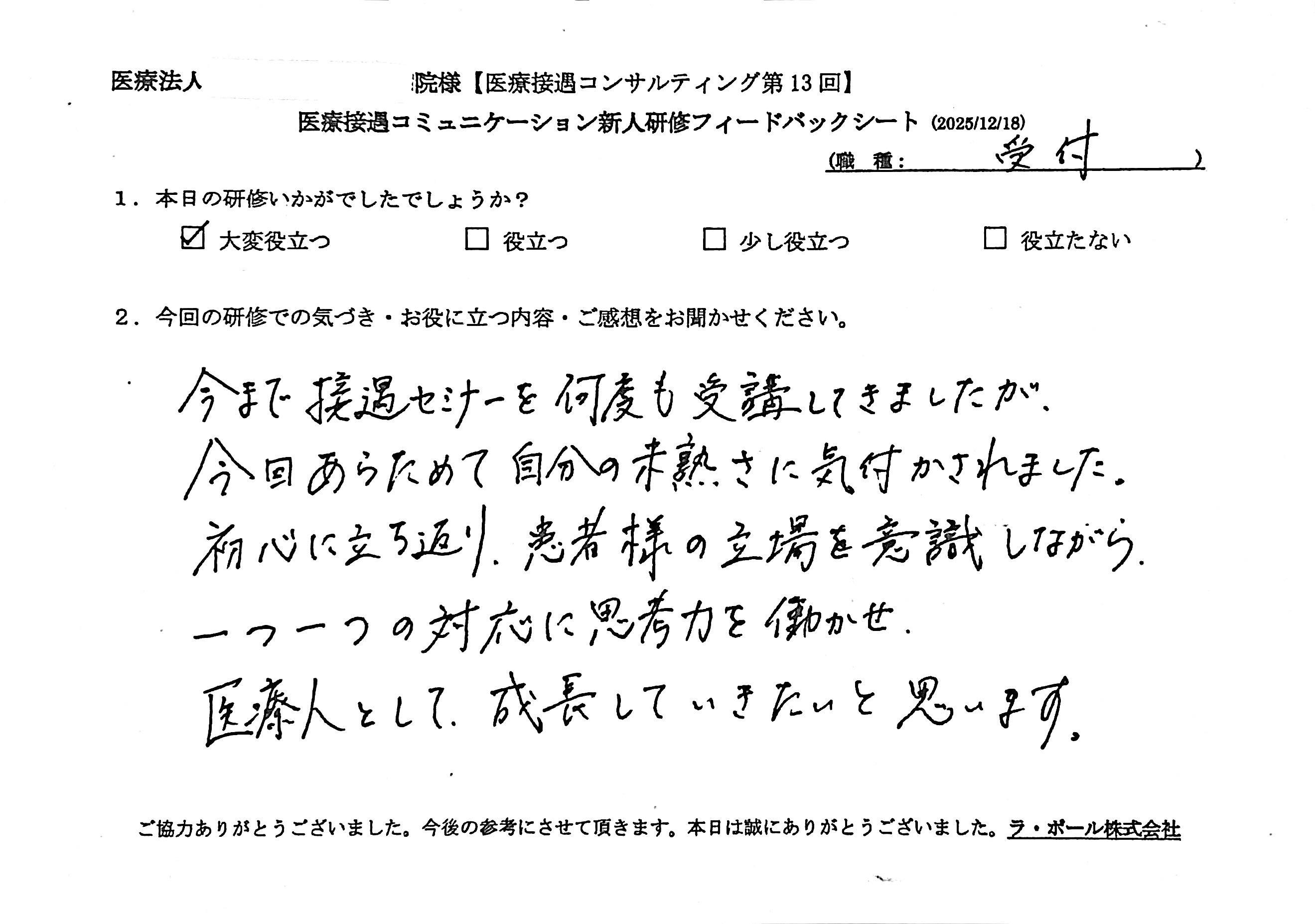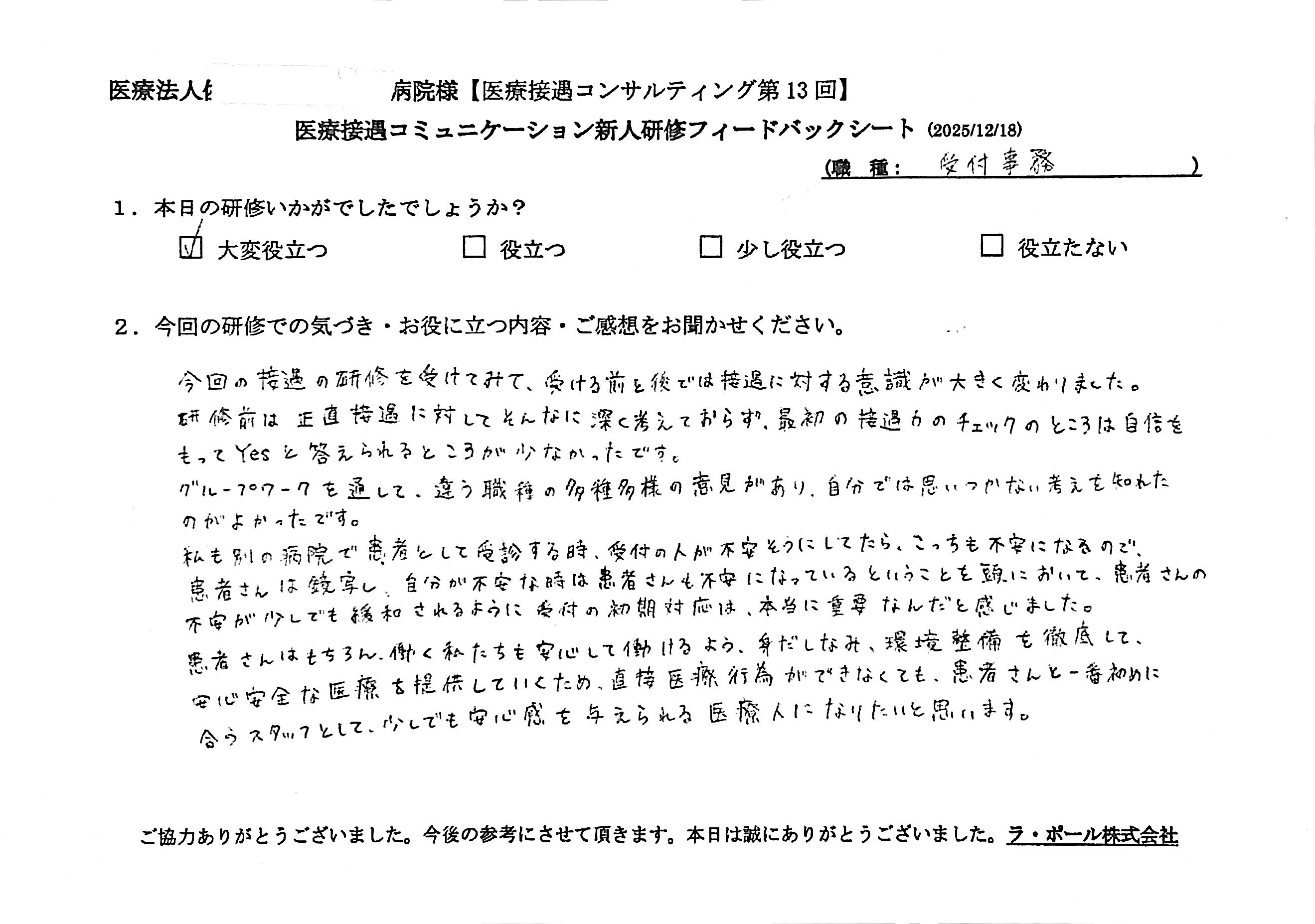私も別の病院で患者として受診するとき、受付の人が不安そうにしていたらこっちも不安になるので、患者さんは鏡写し、自分が不安な時は患者さんも不安になっているということは 頭において、患者さんの不安が少しでも緩和されるように受付の初期対応は本当に重要なんだと感じました。