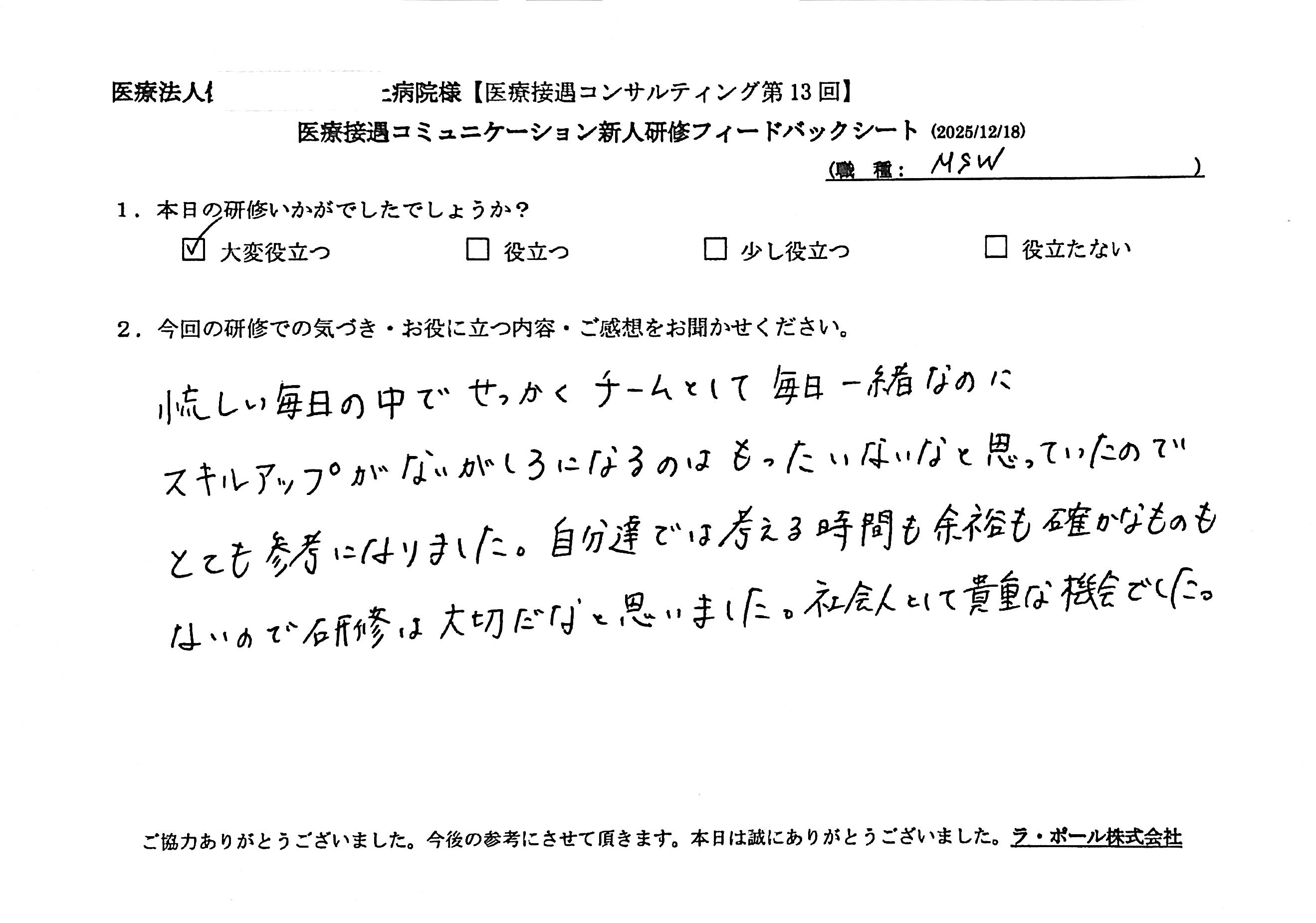 【MSW】自分たちでは考える時間も余裕も確かなものもないので研修は大切だと思いました。社会人として貴重な機会でした。