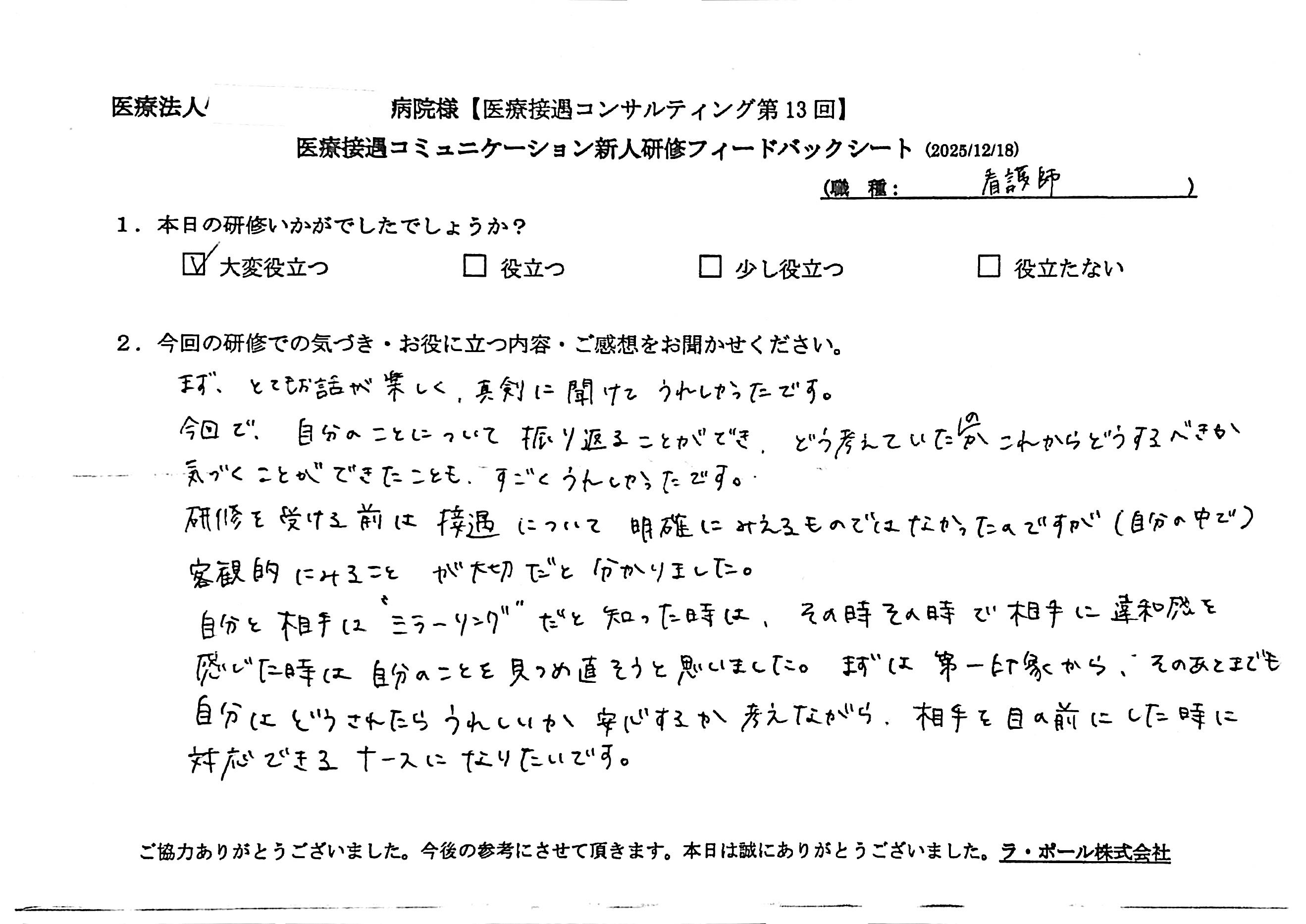 医療現場において、接遇とコミュニケーションがなぜ必要なのか改めて考える機会になり、他の方の意見も聞き自分にはない考えを知ることもできました。