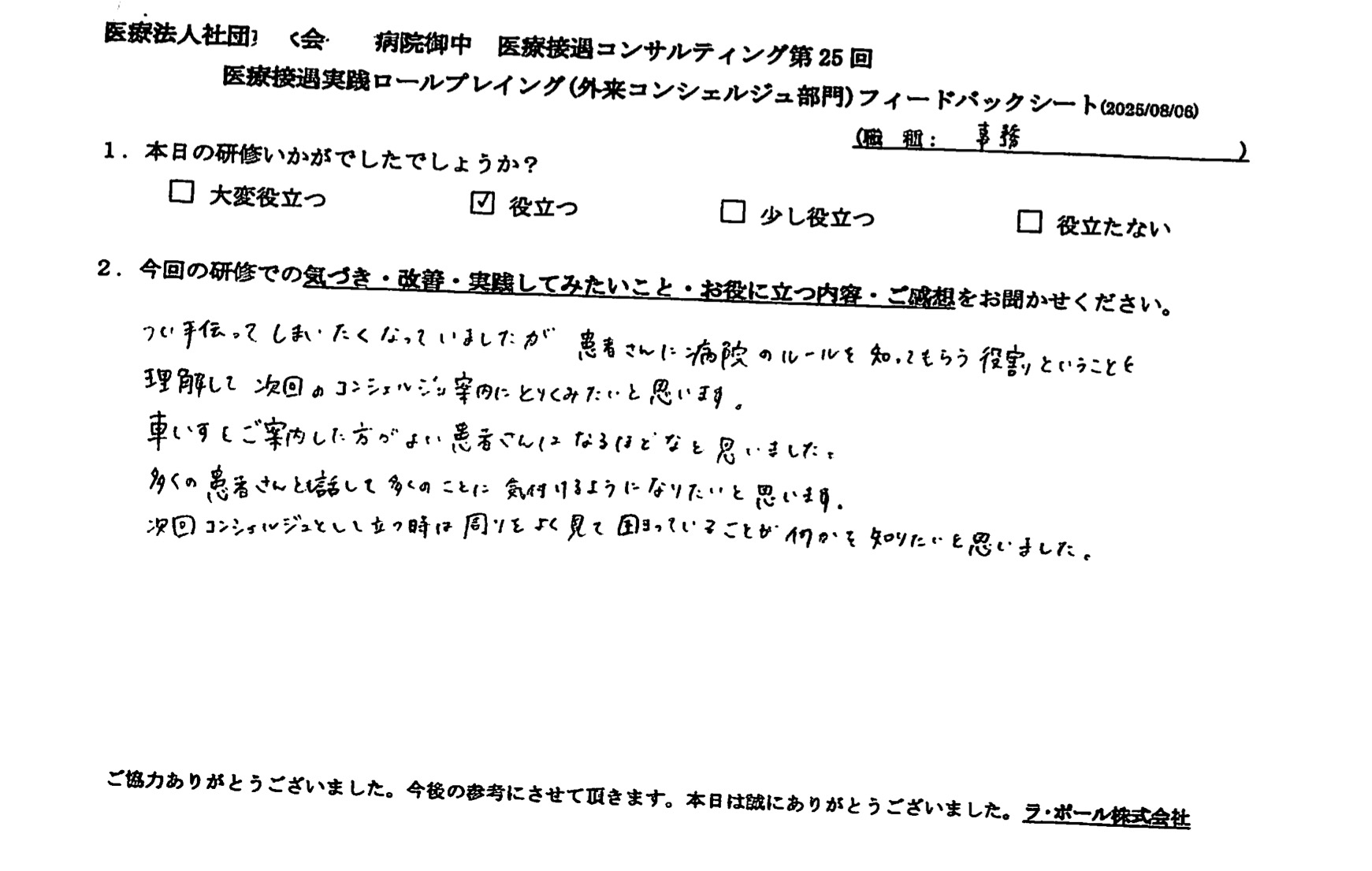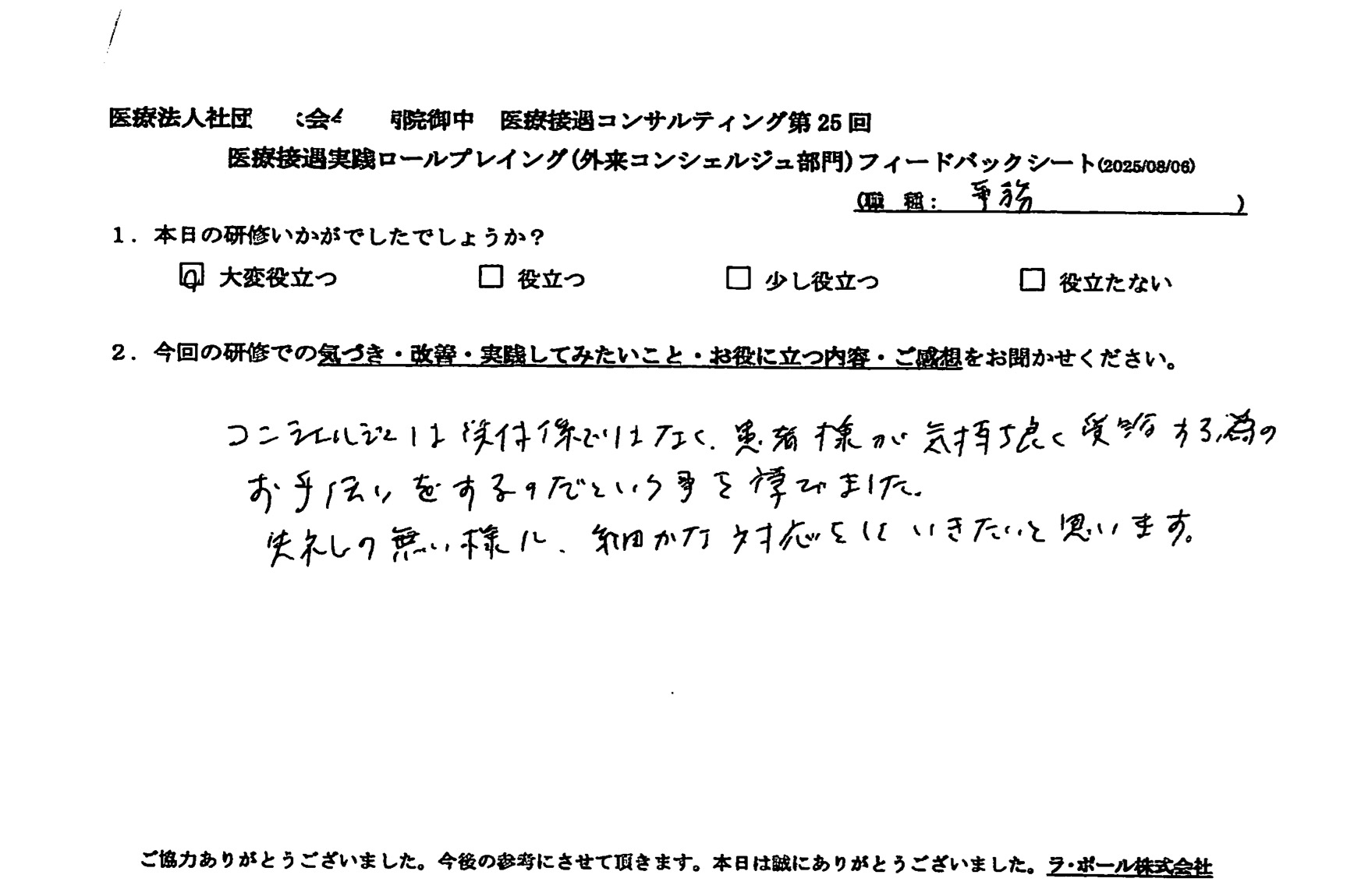【事務】本日は研修に参加させていただきありがとうございました。 外来コンシェルジュの役割について教えていただき、共通認識をすることができました。
